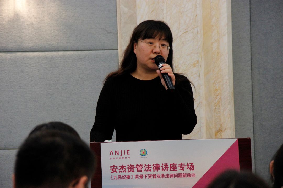 讲座第二部分主题是《<九民纪要>资管纠纷法律适用解读》,由李丹顾问主讲。李丹顾问主要关注的是资管业务监管规则繁多但法律适用规则模糊的问题,认为《九民纪要》明确提出资管业务应适用《信托法》对于理顺资管业务法律适用逻辑、解决当前资管乱象具有重大意义。李丹顾问认为,根据信托法律法规的现行法规和基本原则,可以对资管业务中众多尚无明确法律规定的问题进行更加合理的解释,有助于明确资管业务中当事人(包括发行人、承销人、管理人、投资者等)权利义务的界定、法律责任的性质及承担形式,有助于资管业务从业人员准确理解资管监管规则背后的逻辑和尺度。李丹律师还结合司法案例,分享了她对“刚兑效力”“金融消费者保护”“信托受托人信义义务”等问题的解读。