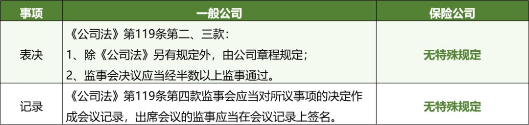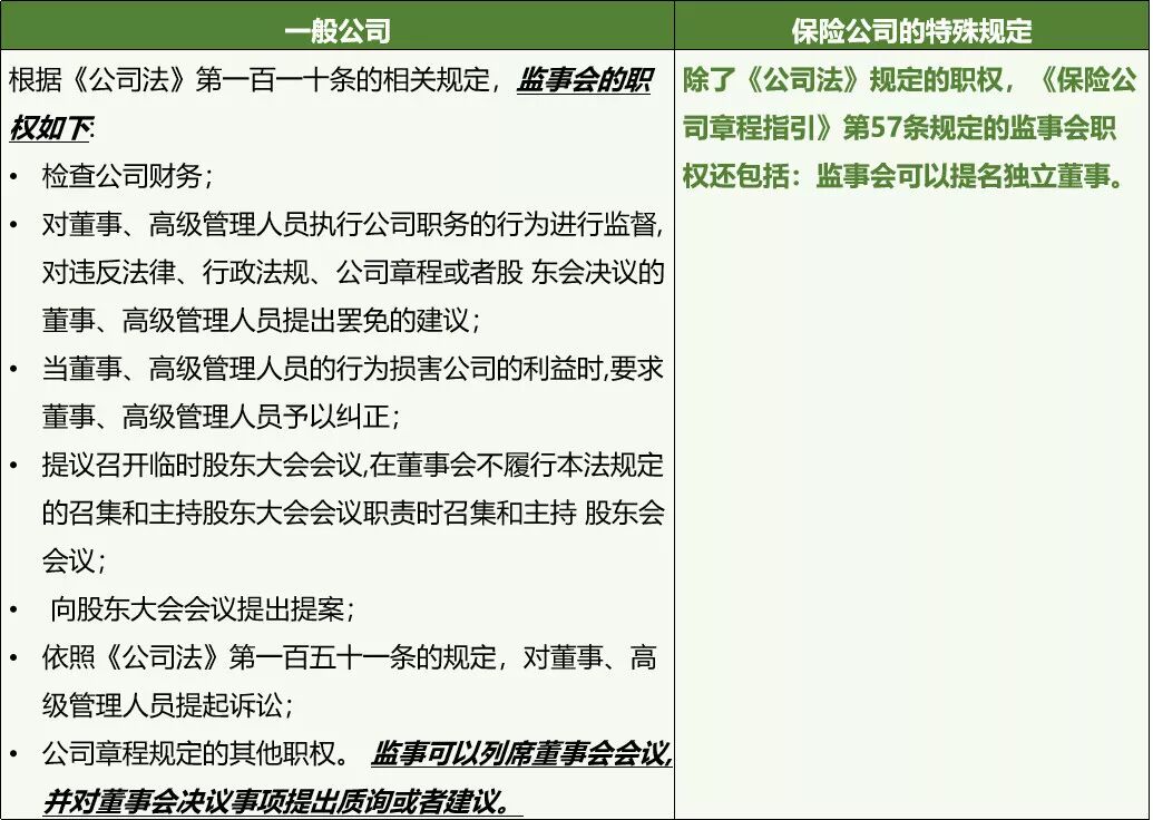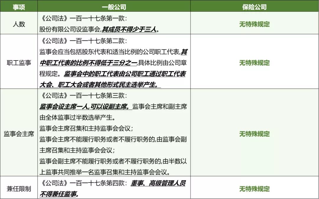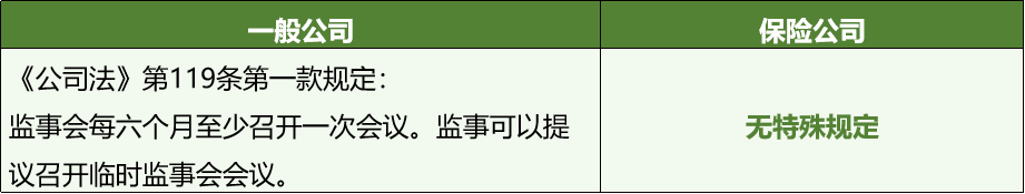 对于监事会,总体而言,保险公司与一般公司差异不大,基本遵守《公司法》等法律规定对监事会的要求即可,具体如下:
