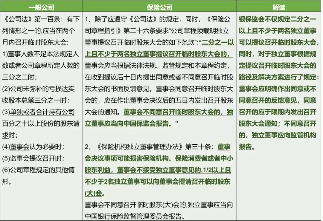 保险公司的年度股东大会要求与《公司法》一致,区别在于临时股东大会的召开情形。在《公司法》规定的一般情形基础之上,银保监会增加了召开临时股东大会的其他情形: