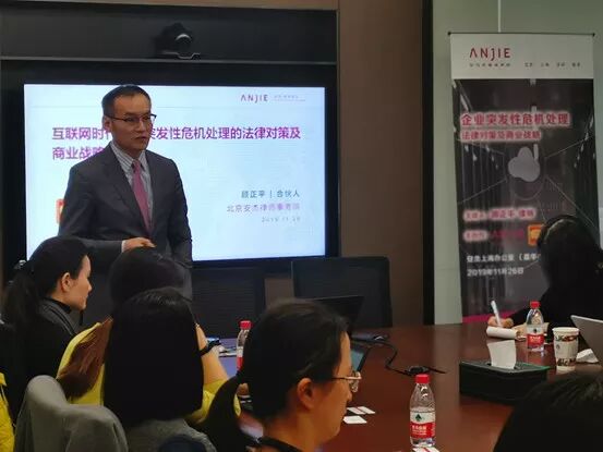2019年11月26日下午,由北京安杰律师事务所主办、法佬汇协办的《互联网时代企业突发性危机处理的法律对策及商业战略》专题讲座在安杰上海办公室举行。来自食品、医药、金融、化工、奢侈品等行业知名企业的总法律顾问、资深法务总监、合规主管和政府关系和公关部门主管等20余位嘉宾参加了本次讲座。