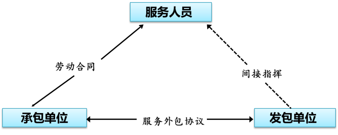 从企业管理角度来看,劳务外包是指企业为了将有限资源专注于其核心竞争力,利用外部专业服务商的劳动力,来完成原来由企业内部完成的工作,从而达到降低成本、提高效率、提升企业对市场环境迅速应变能力并优化企业核心竞争力的一种用工模式。劳务外包的三方法律关系中,承包方与劳务外包人员之间是劳动合同关系或其他雇佣关系;承包方与发包方是民事合同关系;发包方与劳务外包人员之间无直接关系,在具体的外包业务完成过程中发包方一般只是根据服务项目的具体工作要求,通过承包方对劳务外包人员进行间接的指挥。