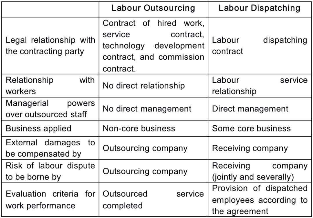 The basic difference between labour outsourcing and labour dispatching can be summarized as follows: