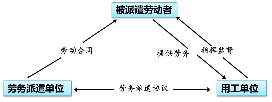 劳务派遣,是指由劳务派遣公司与劳务派遣人员订立劳动合同,劳务派遣公司根据与实际用工单位之间签订的协议,将劳务派遣人员派至实际用工单位处工作的一种用工模式。在三方关系中,劳务派遣公司与劳务派遣人员是法律上的劳动合同关系;劳务派遣公司与实际用工单位之间是民事关系,双方通过签订劳务派遣协议明确双方权利与义务;实际用工单位与劳务派遣人员之间是劳务用工关系,劳务派遣人员直接向实际用工单位提供劳务,实际用工单位对劳务派遣人员直接进行工作安排和指挥监督。