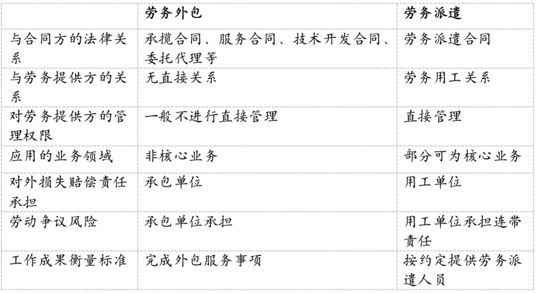 从前述分析可以看出,劳务派遣关系中,企业注重的是对劳动过程的管理,用工单位直接对劳务派遣人员进行指挥监督、工作安排;劳务派遣公司在派出劳务派遣人员后,并不参与劳动过程。而劳务外包关系中,企业注重的是对工作结果的管理,劳务外包人员为承包方提供劳动;发包单位一般并不参与劳动过程的管理,甚至无需关心或者干预承包方用什么人、用多少人,只结合外包服务项目的完成情况,根据与承包方签订的劳务外包协议行使权利、履行义务。