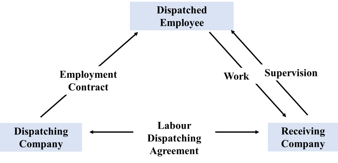 Labour dispatching refers to the type of work where the dispatching company and the dispatched employee enter into an employment contract, and, in accordance with the agreement it signed with the receiving company, the dispatching company sends the dispatched employee to the receiving company to work. In such triple relationship, the dispatching company and the dispatched employee enter into employment at law; the dispatching company and the receiving company enter into civil relationship and define their rights and obligations by concluding a labour dispatching agreement, and the receiving company and the dispatched employee enter into labour service relationship where the dispatched employee provides labour service directly to the receiving company and receives work assignment and supervision directly from the receiving company.
