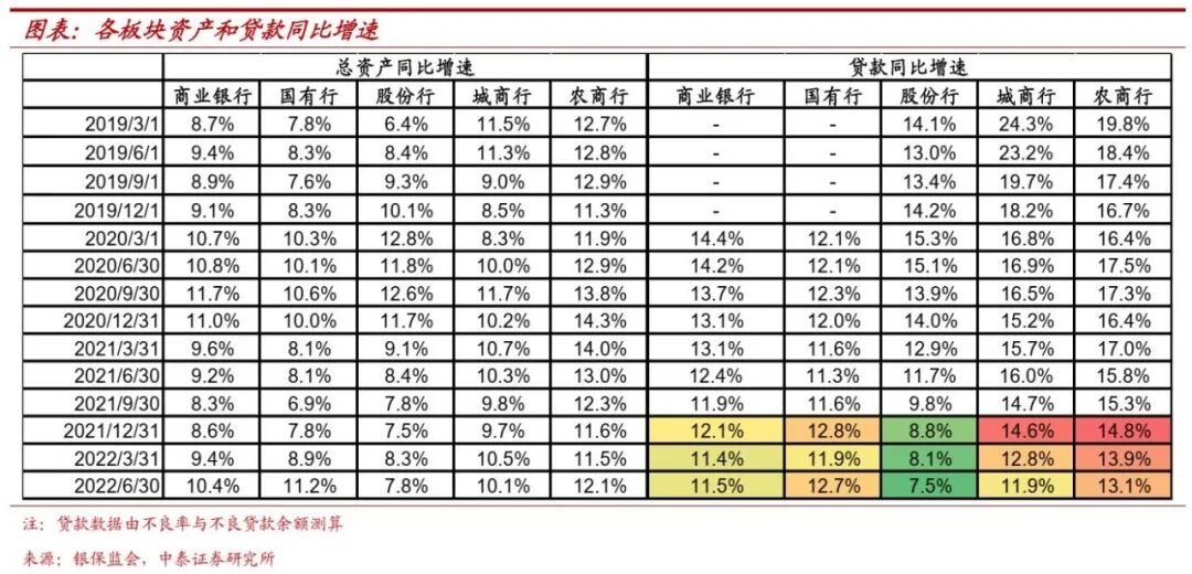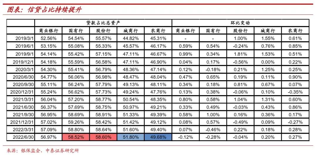 行业二季度资产和信贷增速有边际回暖,国有行是信用扩张的主要支撑,股份行仍面临资产荒的问题。从资产增速看,行业上半年资产同比增速提升1个百分点至10.4%、其中信贷同比增11.5%,高于总资产增速;行业单季信贷规模在4.56万亿。分板块看:1、国有行是二季度行业信用扩张的主要主体,国有行单季新增信贷2.7万亿,国有行总资产同比增速较1季度提升2.3个百分点至11.2%,信贷同比较1季度提升0.8个百分点至12.7%。2、股份行则仍面临从去年3季度以来的资产荒问题,单季新增信贷不足5200亿,同比20年和21年同期都有减弱。在地产产业链下行、同时疫情新生变量扰动因素下,股份行去年3季度开始信贷同比增速就有一定下行,今年2季度信贷同比增速则进一步放缓至7.5%。信贷占比方面,国股行信贷占比保持高位稳定,城农商行信贷占比有小幅提升,分别占比58.5%、58.6%、51.8%、49.7%。(本文信贷数据由不良余额和不良率测算,增速与央行金融数据有误差)。