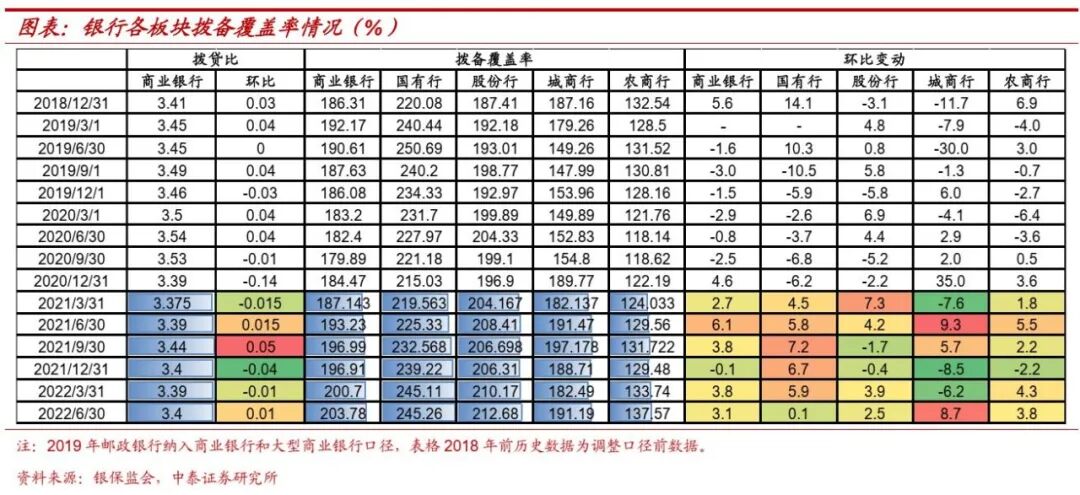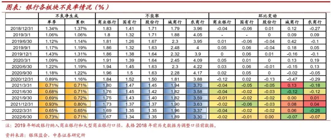 行业不良率环比下行2bp,城农商行不良边际改善最为明显、其中城商行板块实现不良双降。具体来看:1、行业不良率环比下行2bp,不良已经下行至2015年底的水平。2022年6月末全银行业不良贷款规模在2.95万亿,环比1季度增416亿,不良率1.67%,环比下行2bp。2、国有行不良率环比下行1bp,股份行不良率则保持相对平稳。国有行1H22不良率环比1季度下行1bp至1.34%,股份行不良率则环比持平在1.35%,仍是2015年6月以来最优水平。3、城商行和农商行不良率环比有大幅下行,有1季度不良走高的影响,预计内部分化进一步加大。城商行、农商行季度不良率分别环比下行7bp、7bp至1.89%、3.30%。