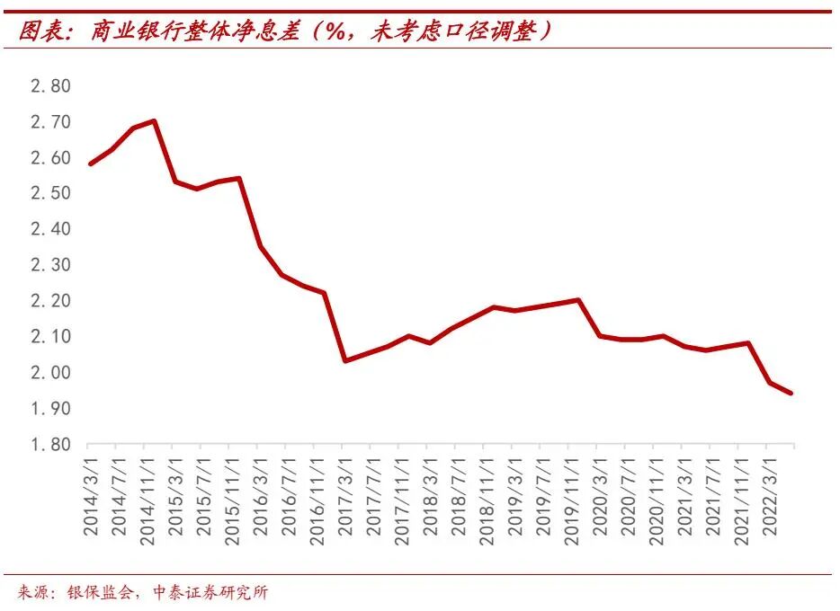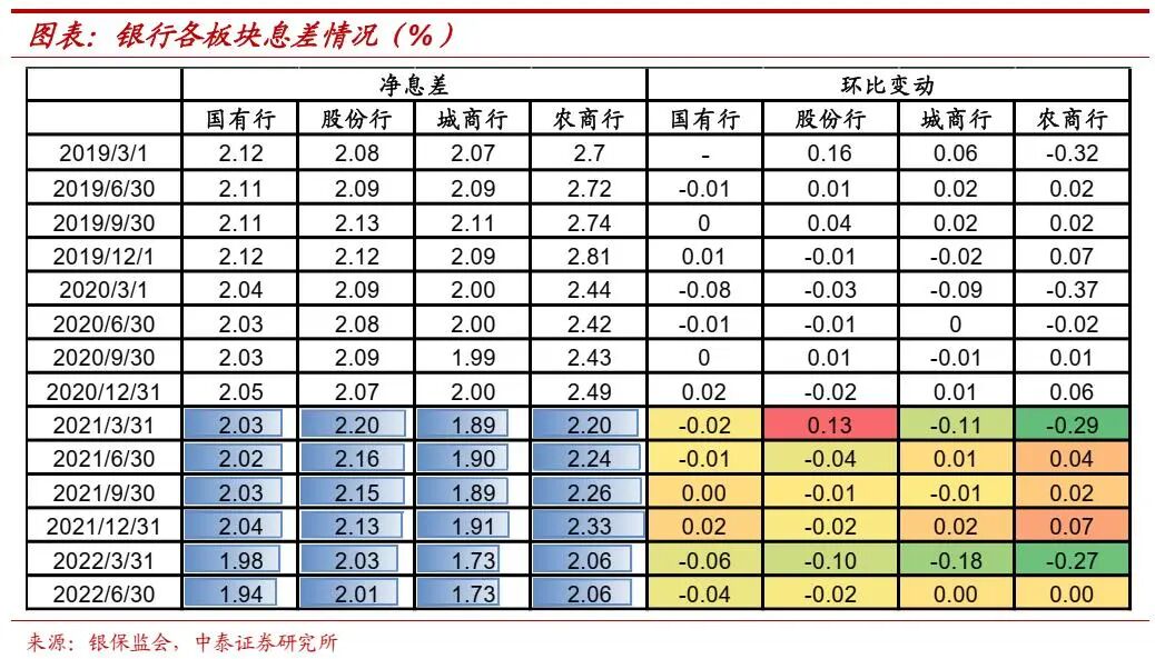 二、行业净息差二季度环比下行,Q2下降幅度较Q1有收敛;考虑重定价的时间分布,预计下半年息差总体平稳/下降幅度收窄。2季度行业净息差1.94%,环比下行3bp。其中板块间息差延续分化趋势,大行和股份行息差有一定承压,城农商行息差则总体保持平稳。一方面5月份5年期LPR下行15bp,国股行中长期贷款的占比要高于城农商行,受到政策利率下行的边际影响更大;另一方面5月初大行下达全年普惠小微贷款全年新增目标,预计贷款定价亦有下行;而股份行受地产产业链拖累,零售端有承压。预计2022年内行业息差仍有一定承压但下行幅度总体有限,一方面5年期LPR下调影响的主要是银行对公中长期贷款和按揭贷款,这部分新增贷款投放更多集中在一季度、存量重定价也主要集中在上半年,5月及以后的LPR下调对今年存量贷款定价的影响有限,影响更多集中在23年一二季度。另一方面若下半年地产销售回暖,银行可以通过调整资产结构、发力零售等途径稳定息差。