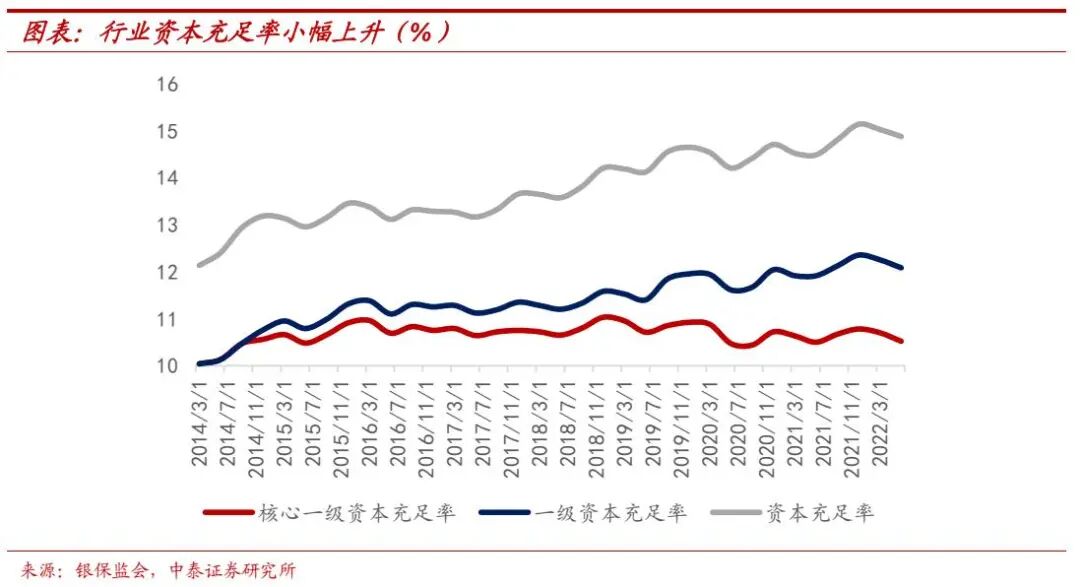五、行业资本维持历史高位。2022年6月底商业银行(不含外国银行分行)核心一级资本充足率为10.52%,环比1季度下降18bp、同比提升2bp。