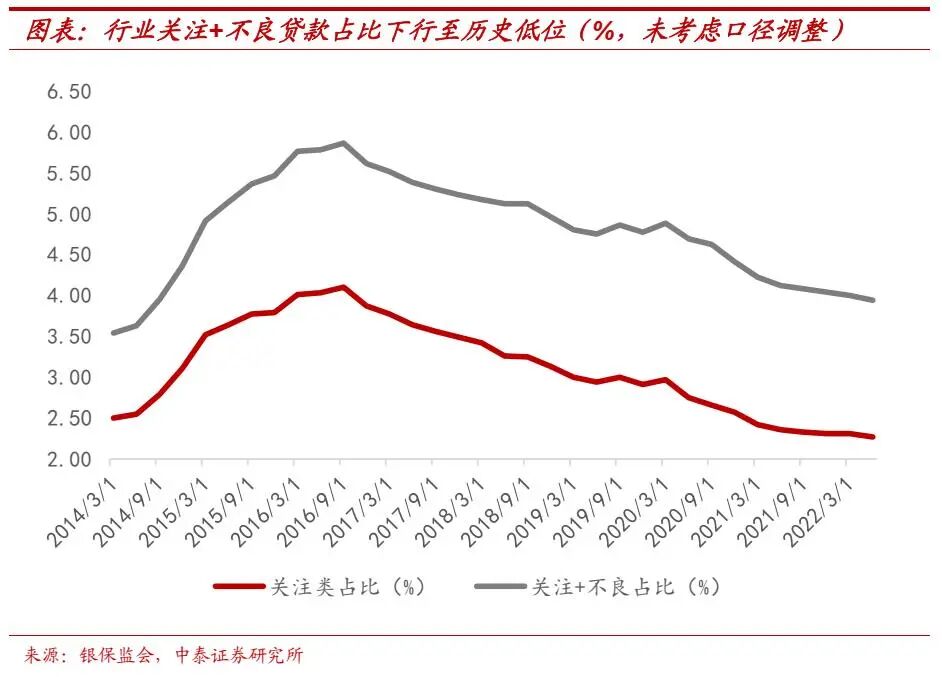 关注类贷款占比环比继续下行,下行幅度高于不良率下行幅度,至历史最优水平,行业未来可能向下迁移为不良贷款的规模可控,行业当前资产质量是较为干净的一个水平。2季度关注类贷款占比为2.27%,较1季度继续下行4bp。