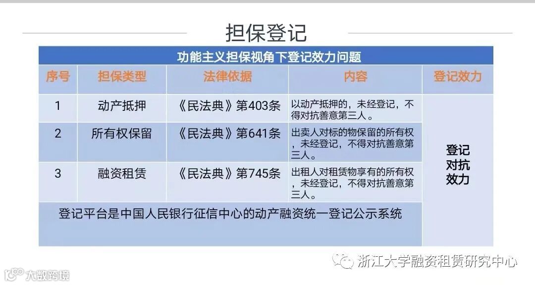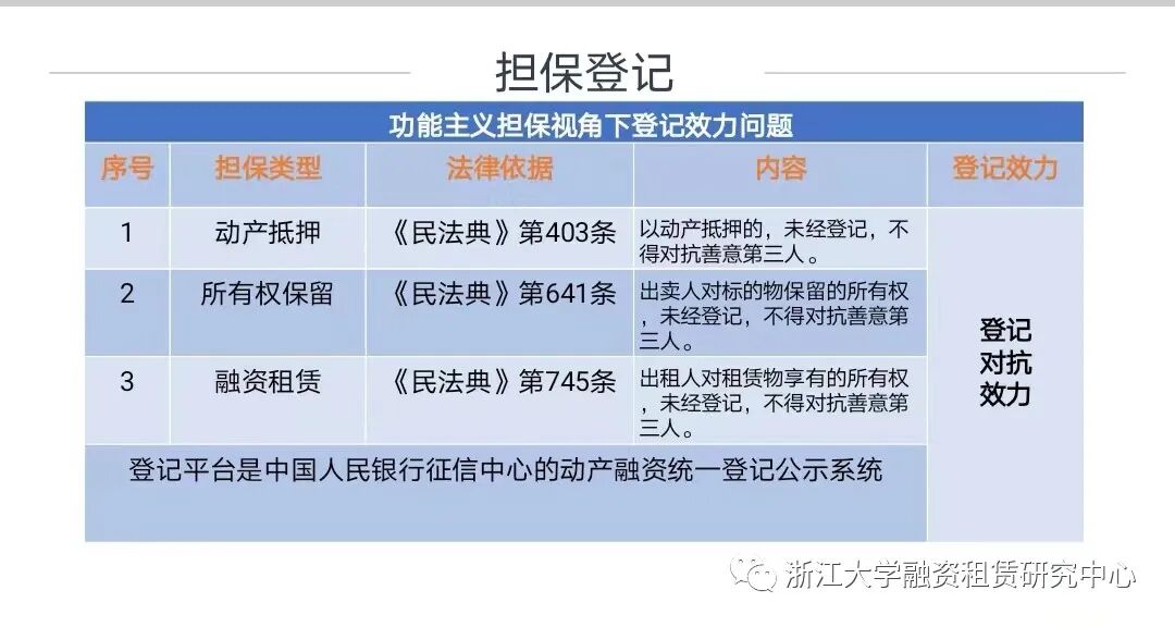 因此,结合现有的立法规定,我们可以看出将融资租赁等纳入功能主义担保制度体系的大方向。在担保物权统一登记制度与统一受偿次序规则两个方面,按期登记的融资租赁将适用担保物权的规则。