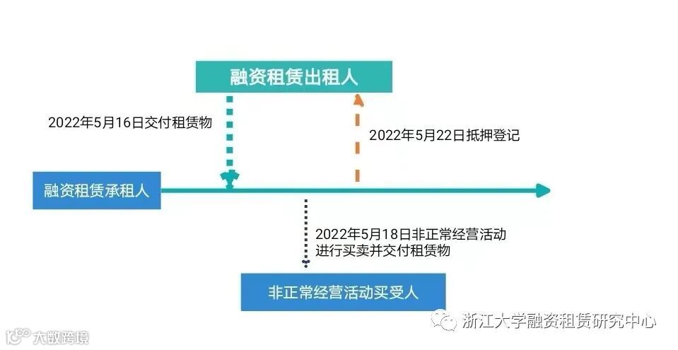 如上图所示,若在租赁物交付承租人后且在未办理宽限期内,租赁物被承租人出卖的,此时租赁物买受人的权利与买受人的权利孰先孰后,同样值得讨论。此时需要区分租赁物的买受人是基于正常经营活动的买受人还是非基于正常经营活动的买受人。出卖人正常经营活动,是指出卖人的经营活动属于其营业执照明确记载的经营范围,且出卖人持续销售同类商品。