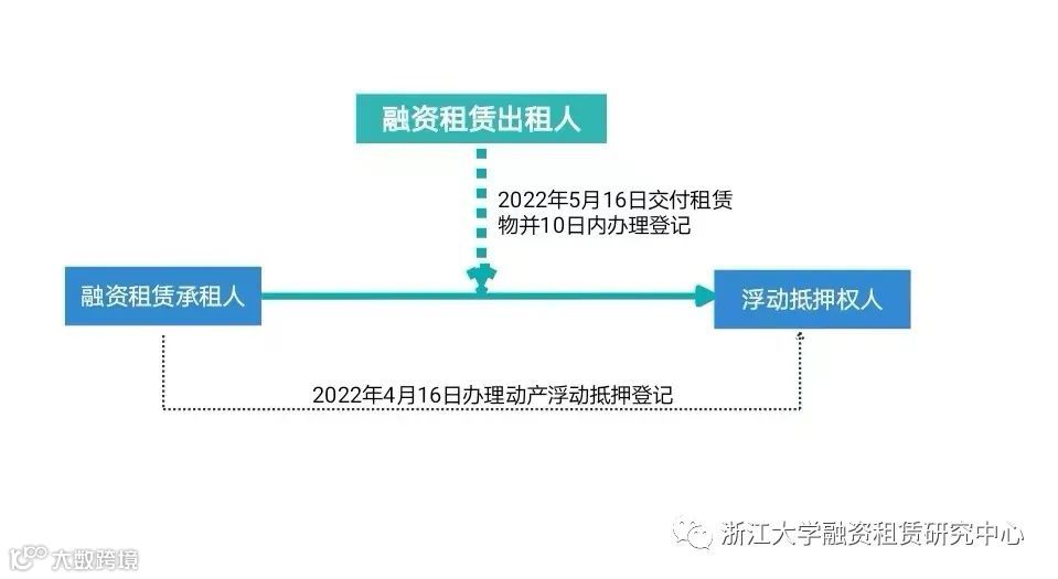 如上图所示,融资租赁的承租人如在2022年4月16日与浮动抵押权利人签订《动产浮动抵押合同》约定,将其名下生产设备、原材料、半成品、产品(与将来通过融资租赁获得租赁物同类)抵押登记给动产浮动抵押权利人。而在2022年5月16日承租人通过与出租人签订《融资租赁合同》获得出租人名下租赁物并在当天进行交付、10日宽限期内办理相关担保登记。此时若严格按照登记在先、受偿在先的受偿次序规则,将来对租赁物的变价款受偿时,浮动抵押权利人优先于融资租赁的出租人。这样的受偿次序规则显然对融资租赁出租人是不公平且严重影响融资租赁承租人进行融资生产偿还浮动抵押权利人的积极性。因此依据《民法典》第416条和《民法典担保制度解释》第57条关于购买价款抵押的超级优先权受偿规则,法律赋予融资租赁承租人在交付租赁物10日内办理登记的,其优先受偿次序优先于动产浮动抵押权利人。