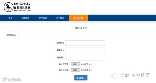 点击导航栏的“身份证上传”填写运单号、收件人、身份证并上传正反面扫描件。