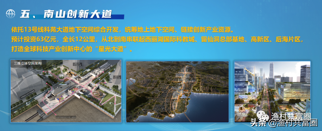 一轴:科技创新轴,依托南山创新大道,连接高新区、留仙洞、大学城等片区。