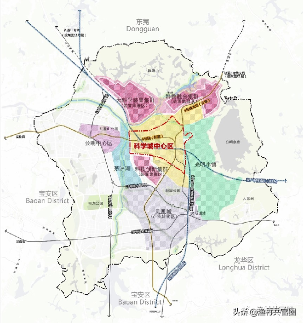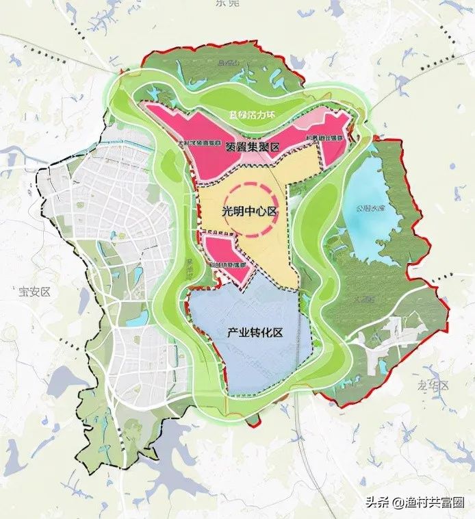 光明规划“一心两区,绿环萦绕”的科学城总体空间布局。