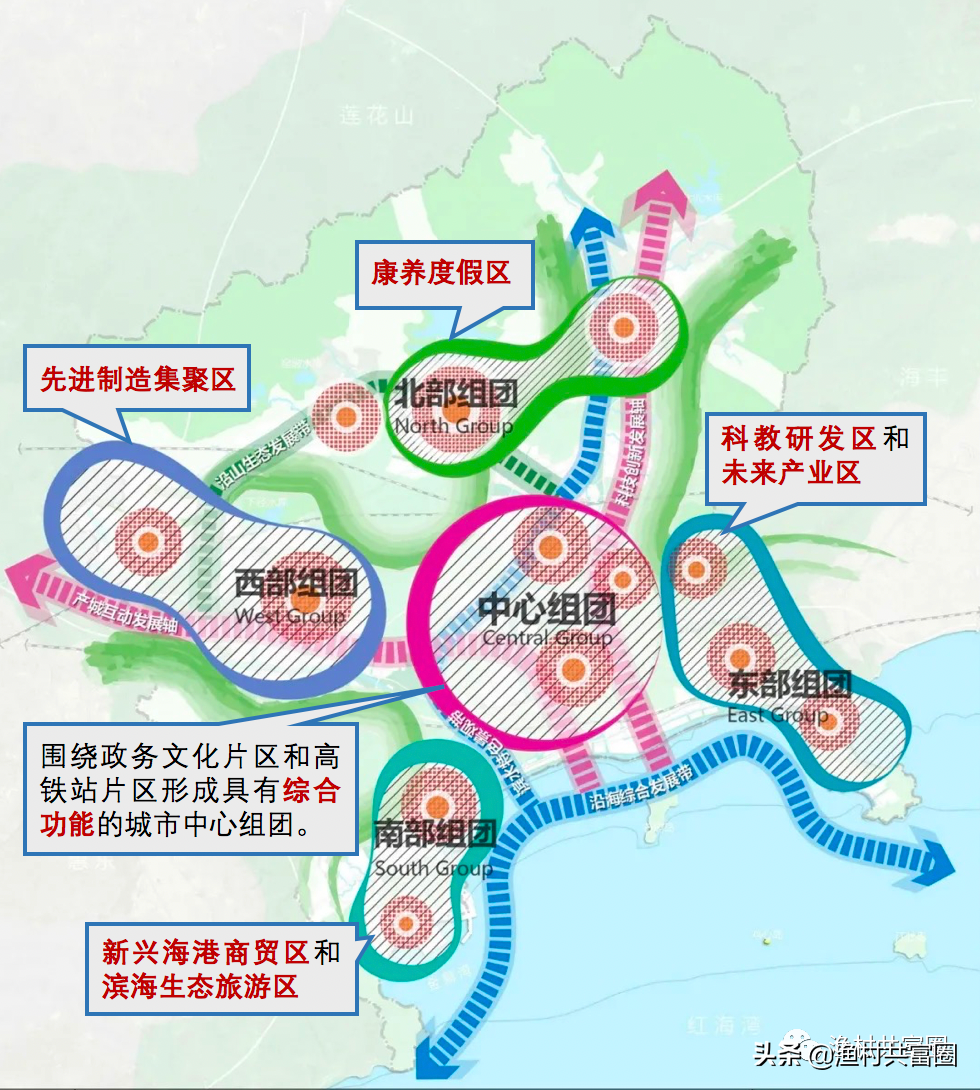 以“东进、西协、南联、北拓、中优”为发展战略,构建“一核、多心、网络化”的城市开发新格局。