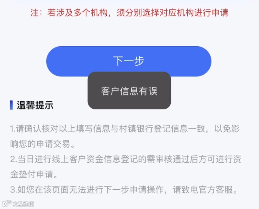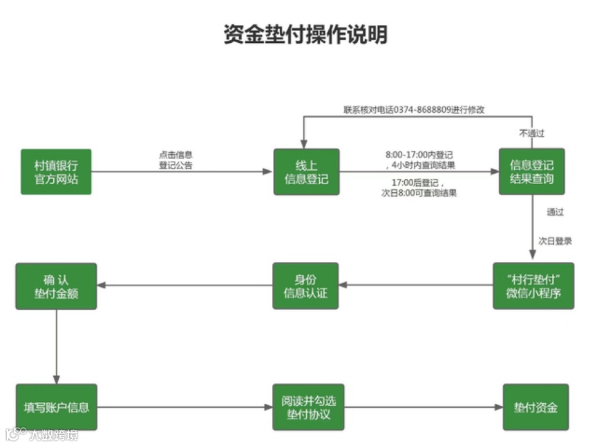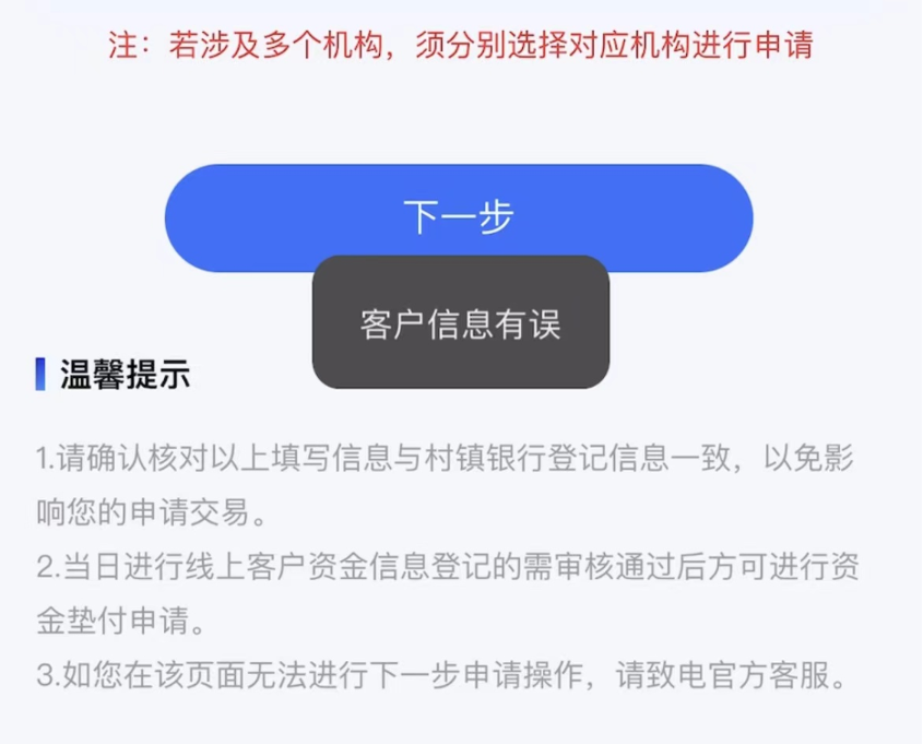 按照操作说明,单家机构单人合并金额5万元(含)以下的客户,应先通过村镇银行官方网站进行线上信息登记,登记通过后次日登录“村行垫付”微信小程序进行身份信息认证、确认垫付金额、填写账户信息、阅读并勾选垫付协议后,将获得垫付资金。