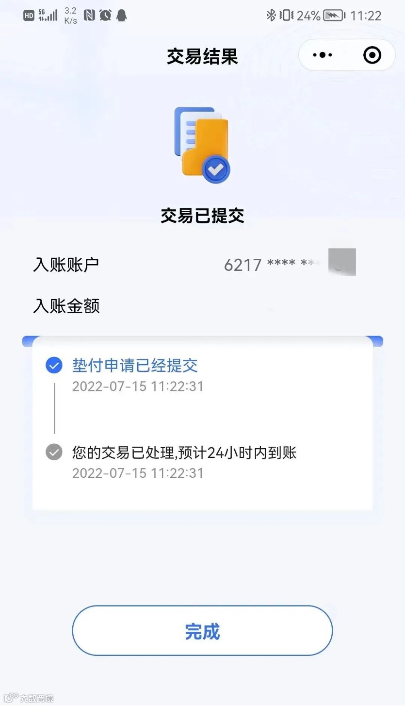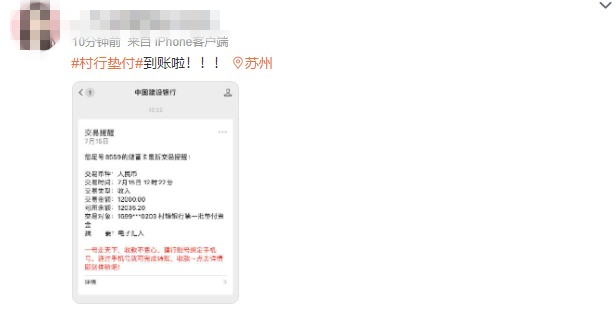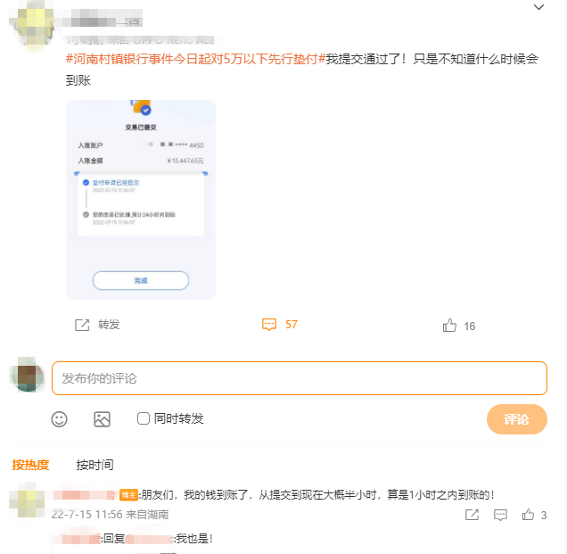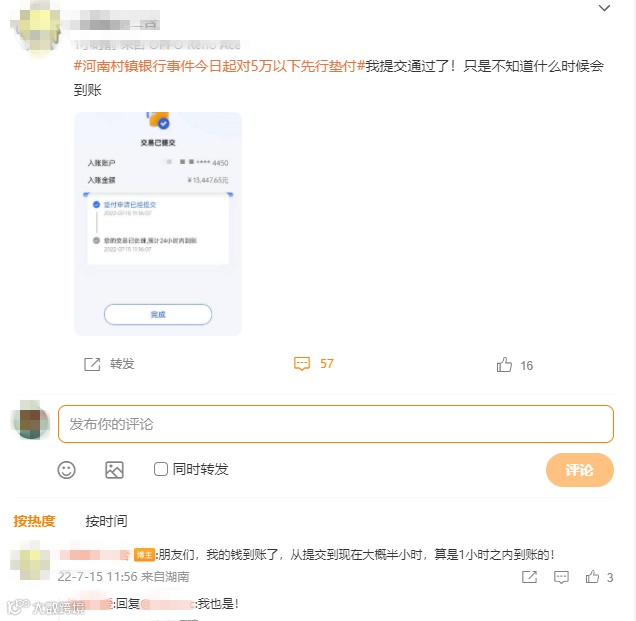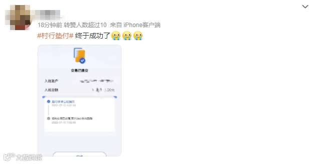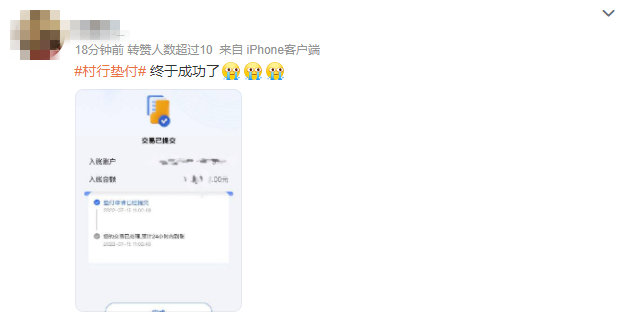 直至7月15日11时左右,陆续有储户表示,已经成功提交了垫付申请,提交申请要勾选同意《垫付协议》,预计24小时内到账。11时40分左右,有储户表示已收到垫付资金。付款方姓名显示为村镇银行第一批垫付资金。