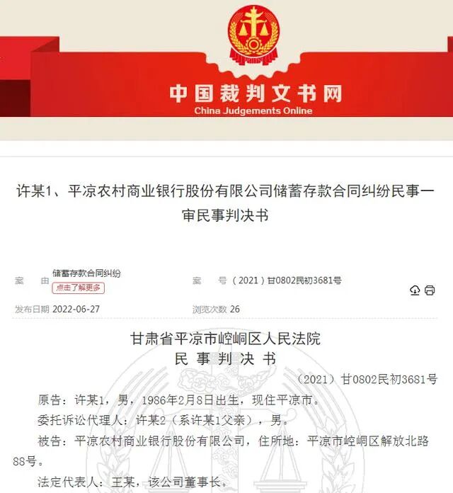 裁判文书显示,许某于2018年4月11日在平凉农村商业银行股份有限公司(以下简称农商银行)解放路支行开办尾号为3774的储蓄卡,该账户未开通消息服务业务,该卡一直由许某保管和使用,密码由许某掌握。
