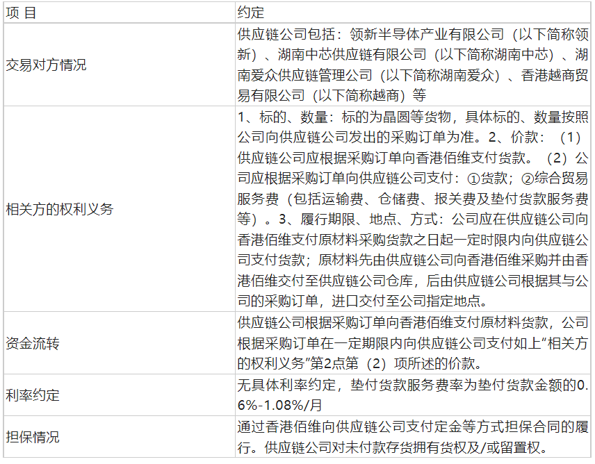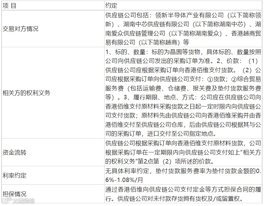 公司与向供应商深圳中电投资股份有限公司采购晶圆等原材料具体情况如下:为保证公司晶圆采购需要,解决资金周转需求,公司存在委托中电投资代理采购三星品牌的晶圆等原材料的情况,根据双方的协议,就每一批物料的采购,公司需向中电投资以《委托采购确认单》的形式确认采购货物事项的基本内容,中电投资根据公司物料采购需求向原厂进行采购,签署相应的采购合同,完成与原厂的采购交易,然后再将所采购的货物销售给公司。按照约定,在中电投资向原厂支付相应款项前3个工作日内,公司需先行向中电投资预付30%的采购货款,故与中电投资形成预付款。