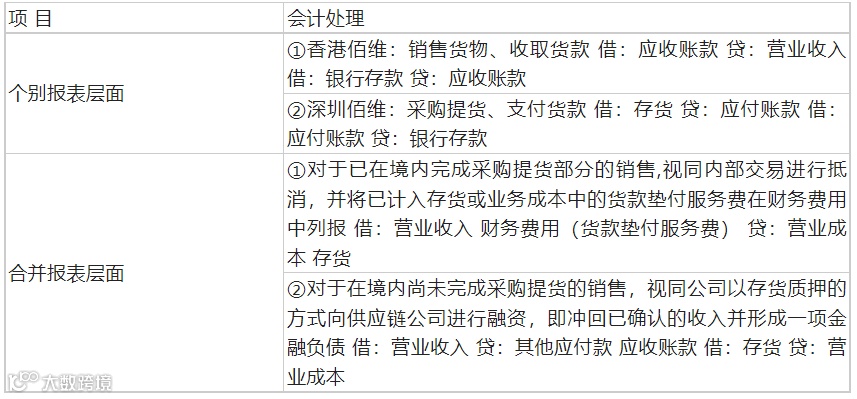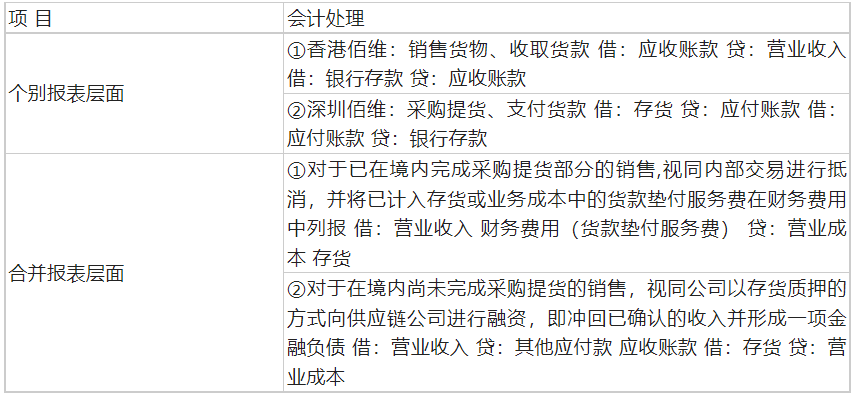 第二种业务模式情况下,境内公司深圳佰维与供应链公司签订采购合同,委托其向香港佰维采购原材料,最终完成原材料由境外向境内的购销交易,各交易主体基于原材料进行采购及销售,具有商业实质。但由于深圳佰维与香港佰维属同一集团内公司,从公司整体层面来看,将采购额和销售额进行合并抵消,并将因采购销售资金流转时间差异而导致的资金收付余额(货款垫付余额)记为一项负债,具体账务情况处理如下:
