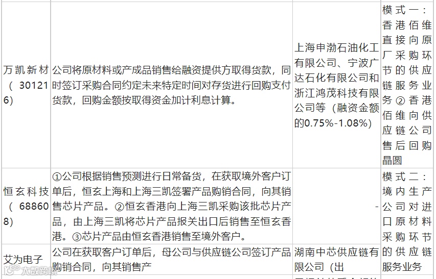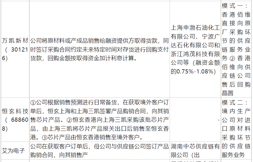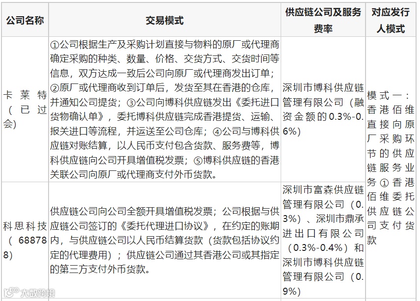 经检索市场案例,相关公司如卡莱特(已过会)、科思科技(688788)、万凯新材(301216)、恒玄科技(688608)、艾为电子(688798)等存在使用供应链服务的情形。