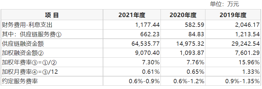 由上表可知,公司的加权月费率与合同约定的服务费率一致,融资费用与财务费用中利息支出具有勾稽关系。报告期内,公司的服务费率逐年降低,主要系公司经营业绩和净资产规模不断增加,行业地位和影响力稳步提升,综合实力逐渐增强,供应链服务商选择面增多。2020年服务费金额较少,主要系公司当年新增股权融资,资金来源增加从而减少了供应链融资金额。