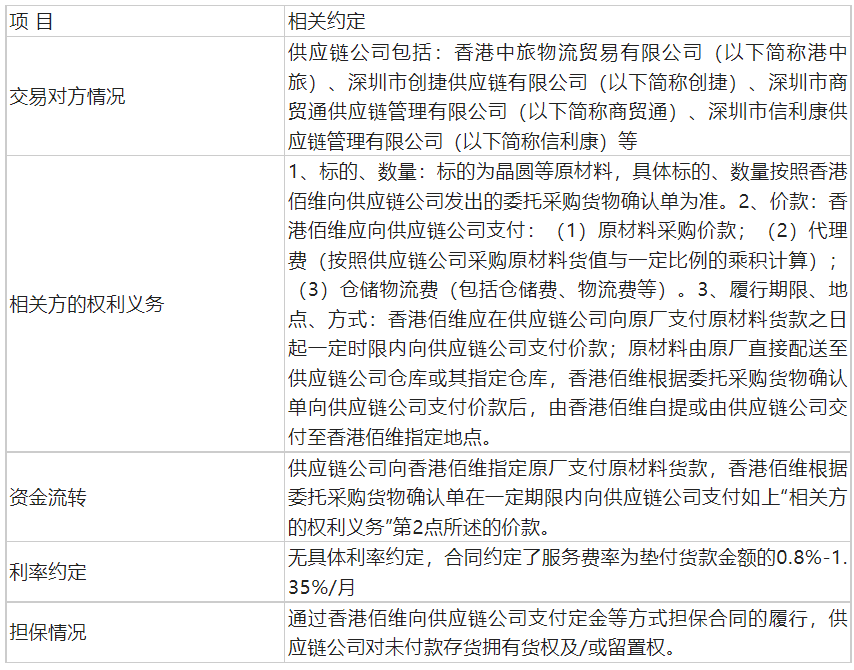 为有效利用供应链服务,降低运营成本,公司存在委托专业的供应链公司提供上述相关服务的情况。按照行业惯例,操作模式如下:公司与供应链公司签订采购合同,委托其向香港佰维采购原材料,过程中的物流、仓储、报关、税费缴纳等环节由供应链公司负责,最终完成原材料由境外向境内的购销交易。在原材料由境外向境内的购销过程中,存在供应链公司垫付货款的情况。