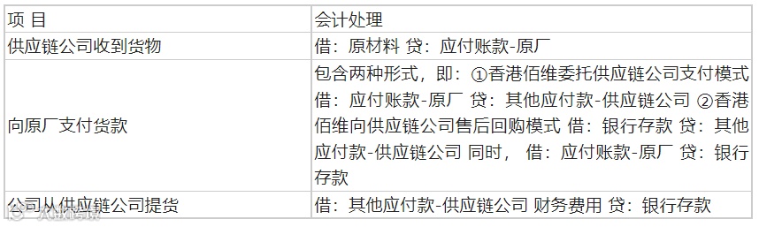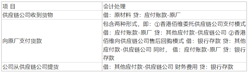 在会计处理方面,供应链公司收到货物后公司确认存货,并形成对原厂供应商的采购负债,待供应链公司支付货款后,公司终止对原厂供应商的采购负债,并形成对供应链公司的金融负债;模式一仅涉及香港佰维,具体账务处理情况如下: