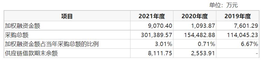 从加权融资金额来看,报告期内公司的加权融资金额分别为:7,601.29万元、1,093.87万元和9,070.40万元,占采购总额比例分别为:6.67%、0.71%、3.01%,占比较低,公司的供应链融资金额与采购总额变动趋势较为一致。2020年加权融资金额较少,主要系公司当年新增股权融资,资金来源增加从而减少了供应链融资金额。