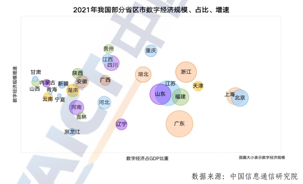 2021 年有16个省市区数字经济规模突破1万亿元,较去年增加3个,包括广东、江苏、山东、浙江、上海、北京、福建、湖北、四川、河南、河北、湖南、安徽、重庆、江西、辽宁等。