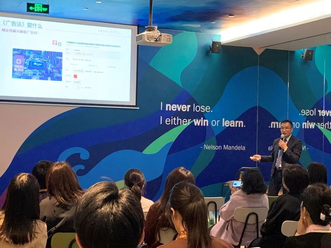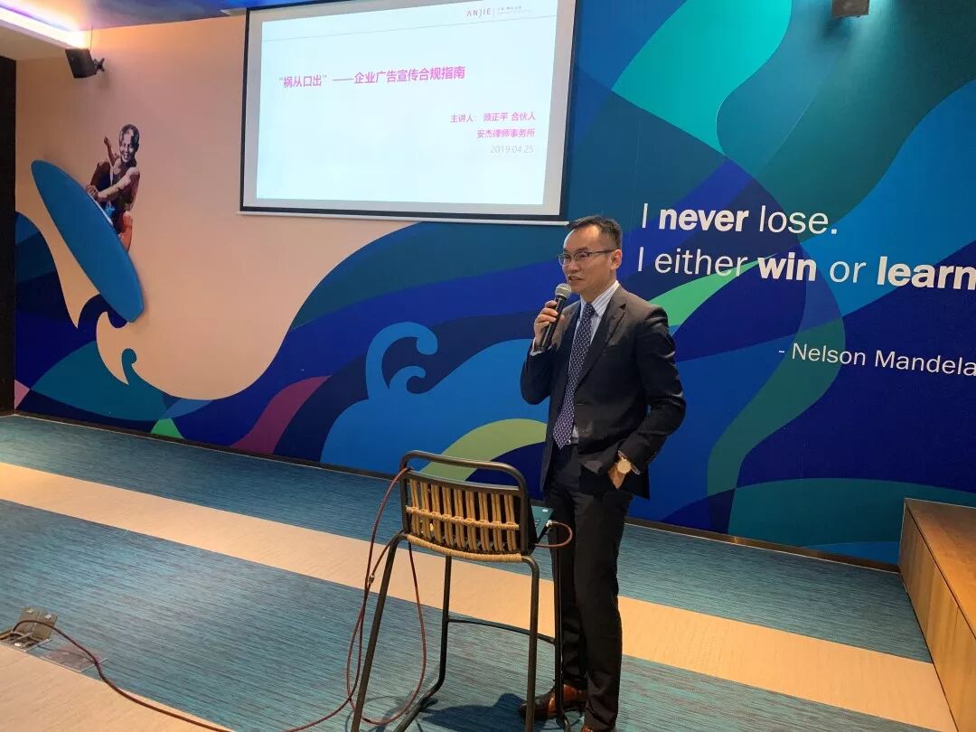 安杰律师所创始合伙人顾正平律师作为本次培训的特邀讲师就广告合规做了全面细致的专题讲解。本次培训分为四个板块,以《广告法》、《反不正当竞争法》等为中心,分行为线与行业线两条主线进行讲解。顾律师首先通过生动、丰富的案例及案例大数据分析介绍了商业广告的界定、广告法主体的范围、广告违法的各类风险、广告违法的处罚数据统计等广告法基础知识。在第二部分,顾律师深入浅出地讲解了莫斯利安长寿酸奶案、佳洁士美白PS案、瓜子二手车遥遥领先案、方林富炒货案等近五十余个经典的司法判例、行政处罚及实务案例。顾律师通过庖丁解牛式的解读,将广告中的虚假宣传、虚假广告、欺诈、绝对化用语、比较广告等核心问题进行了系统化、专业化的总结。顾律师还通过跨性别代言广告、童星代言等探讨了广告代言中的热点问题。在第三部分,顾律师全面细致地梳理了医疗行业(医疗、药品、器械)、食品行业(保健食品、特医食品等)、地产行业、烟酒行业等特殊行业的广告监管法规及违法案例,分析了特定行业营销宣传中易被处罚的违法广告语和合规对策。最后,顾律师还通过讲解瓜子二手车遥遥领先案、3Q广告屏蔽案等分析了企业面对竞争对手虚假宣传时的诉讼制衡策略及广告屏蔽的不正当竞争等前沿问题。此外,顾律师还通过一系列案例讲解了互联网领域广告合规的变(一键关闭等)与不变(公序良俗等)。培训过程中与结束后的讨论环节中,台下嘉宾踊跃提出问题进行探讨,顾律师针对嘉宾们的问题结合实务进行了耐心的解答。顾律师深入浅出的演讲及轻松诙谐的风格获得了在座嘉宾的一致好评。