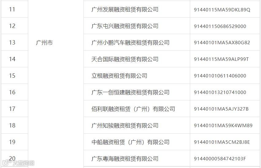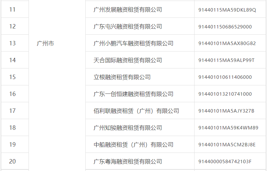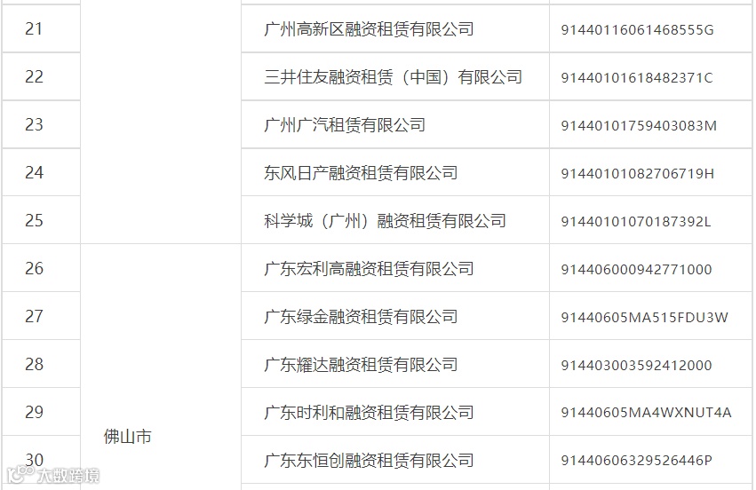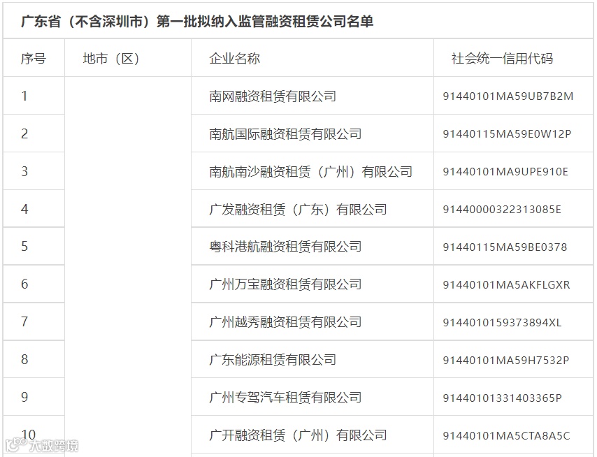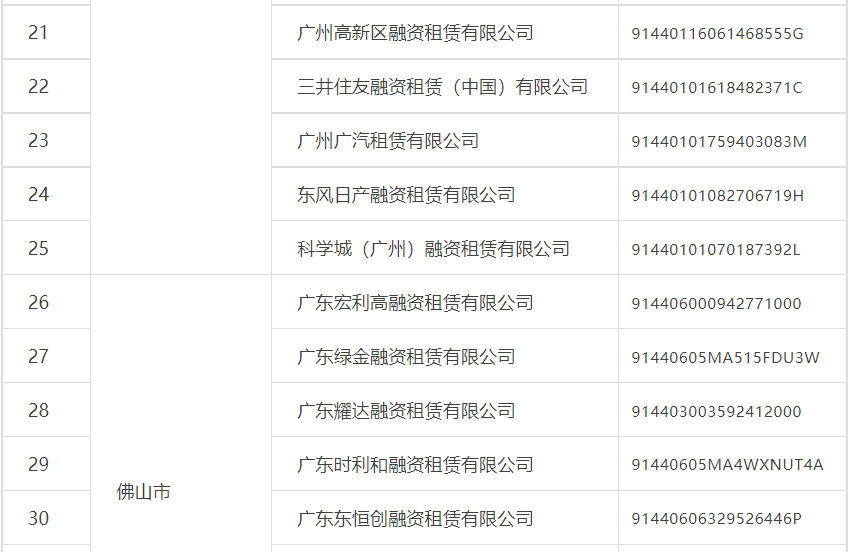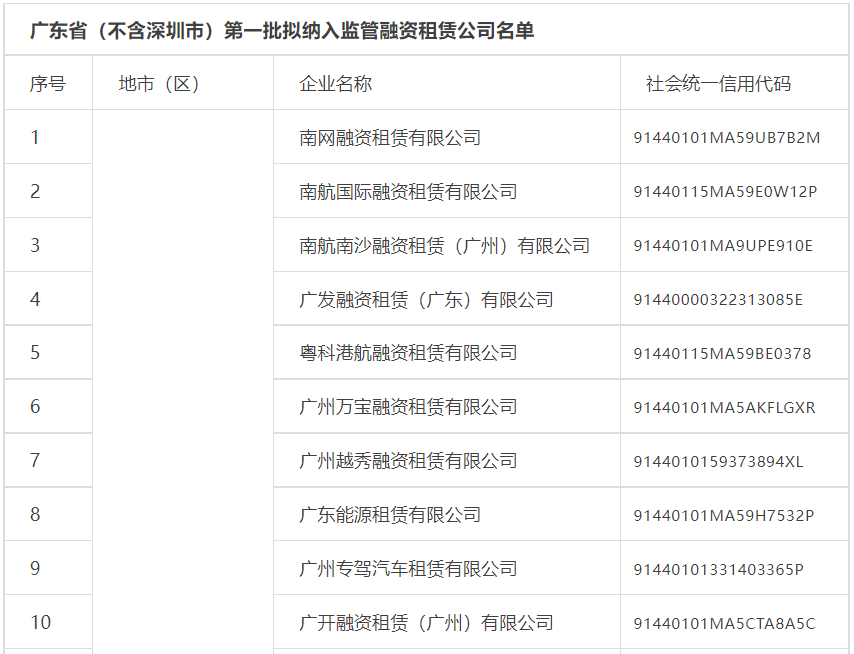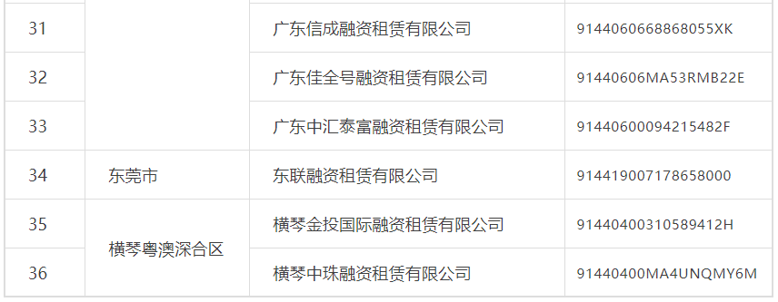 2022年2月21日,广东省地方金融监督管理局印发《关于广东省(不含深圳市)第一批拟纳入监管融资租赁公司名单的公示》,名单一共36家融资租赁公司。
