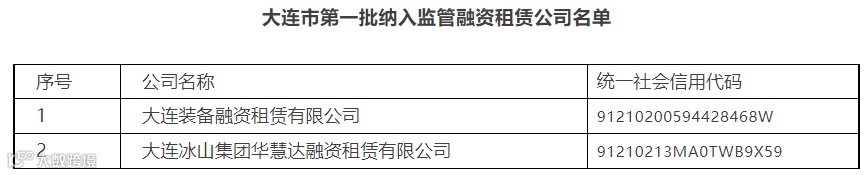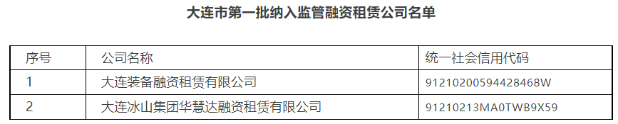2022年6月24日, 大连市金融发展局发布关于大连市第一批纳入监管融资租赁公司名单的公告,共计2家融资租赁公司纳入第一批监管名单。