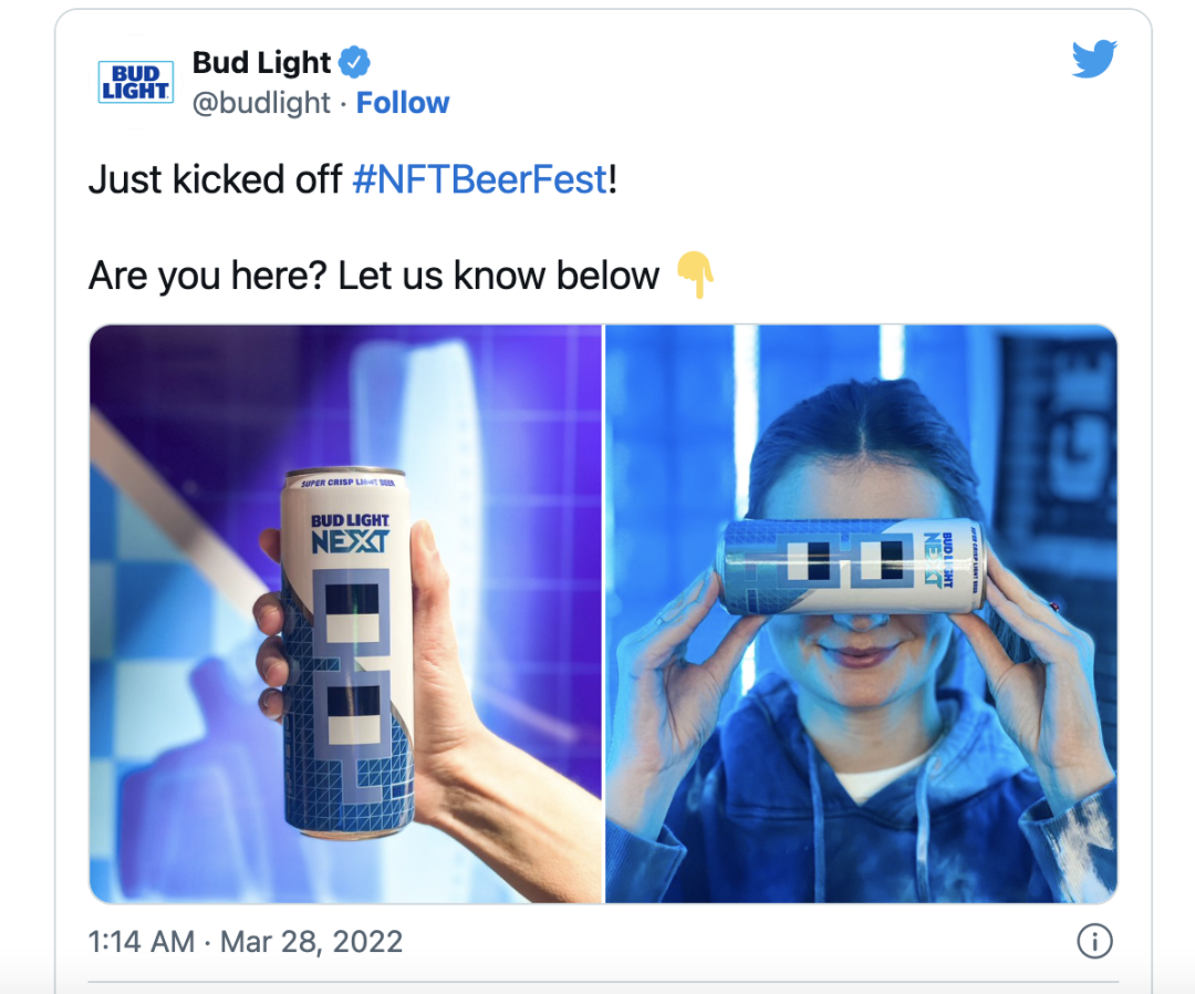 2022 年 3 月,饮料公司Anheuser-Busch在其旗舰啤酒厂举办了一场#NFTBeerFest 活动,该活动是为其子公司百威啤酒的特定 NFT 持有者保留的。