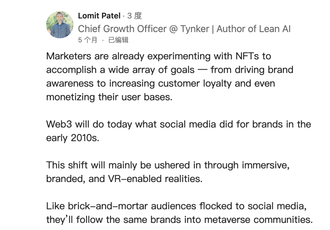 Together Labs 增长高级副总裁 Lomit Patel 最近在 LinkedIn 上分享说,他认为 NFT 今天正在做社交媒体在 2010 年所做的事情——极大地提高了他们在品牌知名度和受众范围方面的潜力。