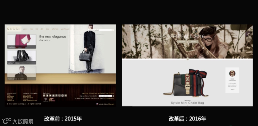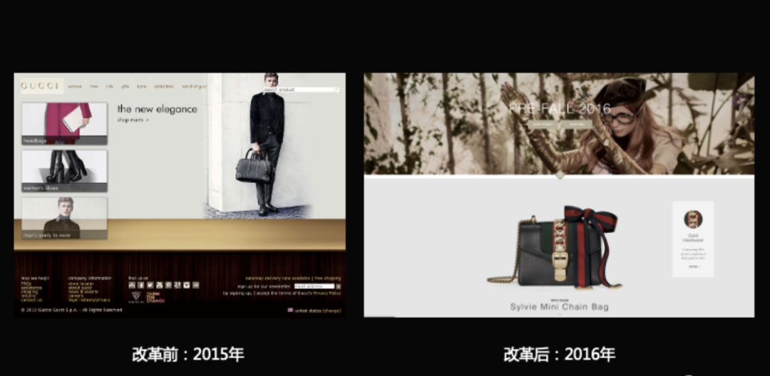 2010年开始,由于其主要客户群体——有钱的中年人——消费能力降低,老牌奢侈品牌Gucci业务出现增长放缓甚至停滞的问题。通过营销数据分析,Gucci决策层发现消费主体开始向年轻人倾斜,因此从2015年开始品牌营销主题不再一味强调Guccie的历史悠久和高贵冷艳,而是转而向千禧一代的消费者透传品牌的年轻感,色调也更加明艳张扬,以凸显青春的活力感。