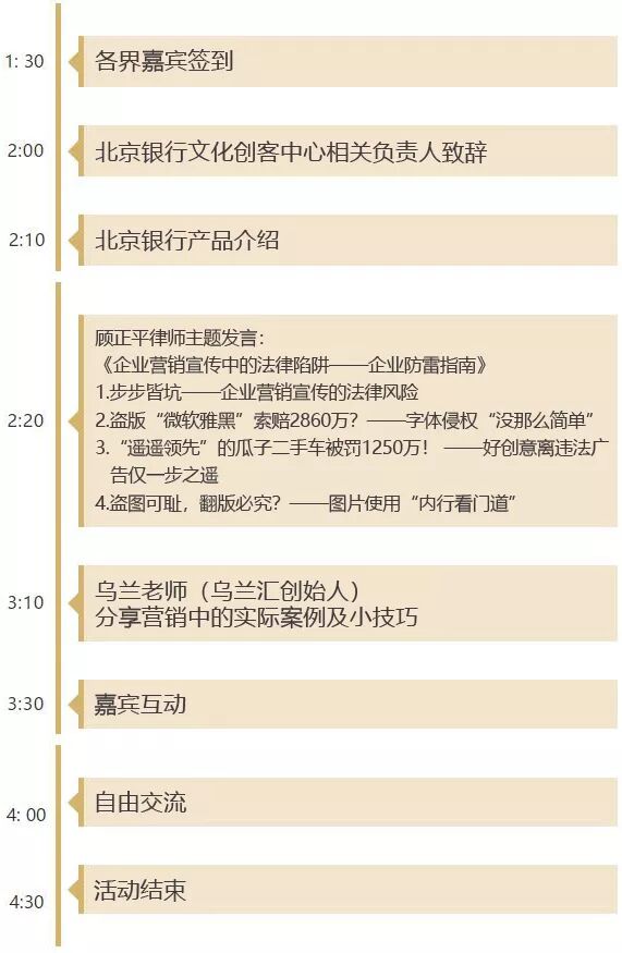 北京银行文化创客中心与乌兰汇拟定于3月22号(周五)下午,联合举办《文化企业营销宣传中的版权陷阱——企业防雷指南》文化沙龙活动。安杰律师事务所的合伙人顾正平律师,将从专业的角度教给大家一些实用技巧。