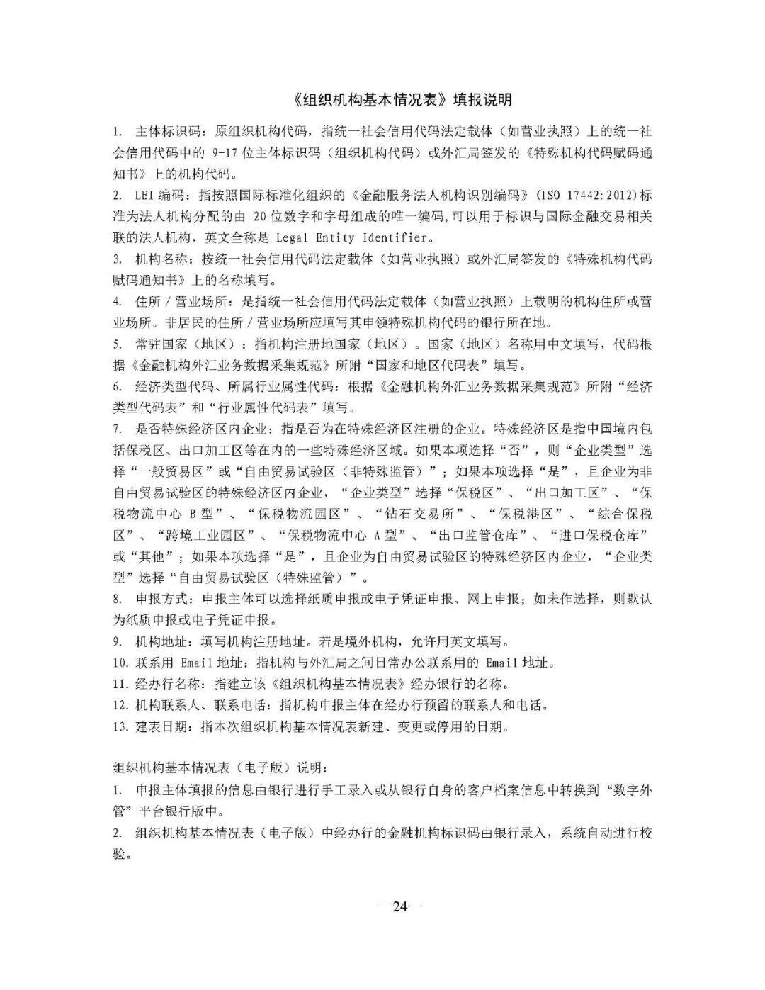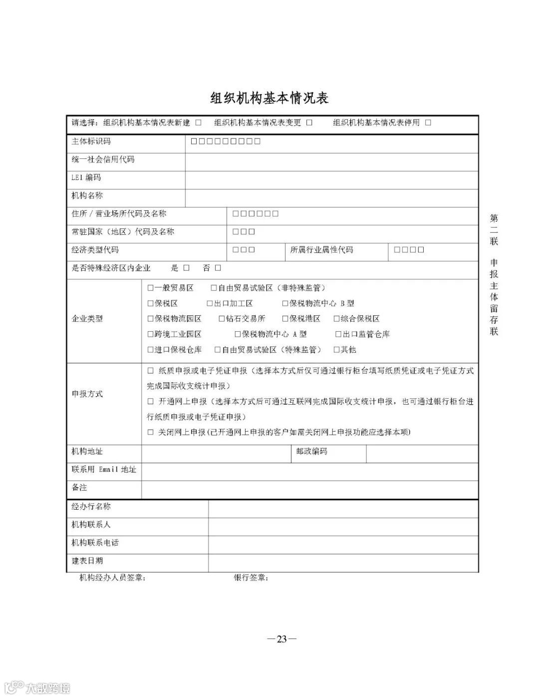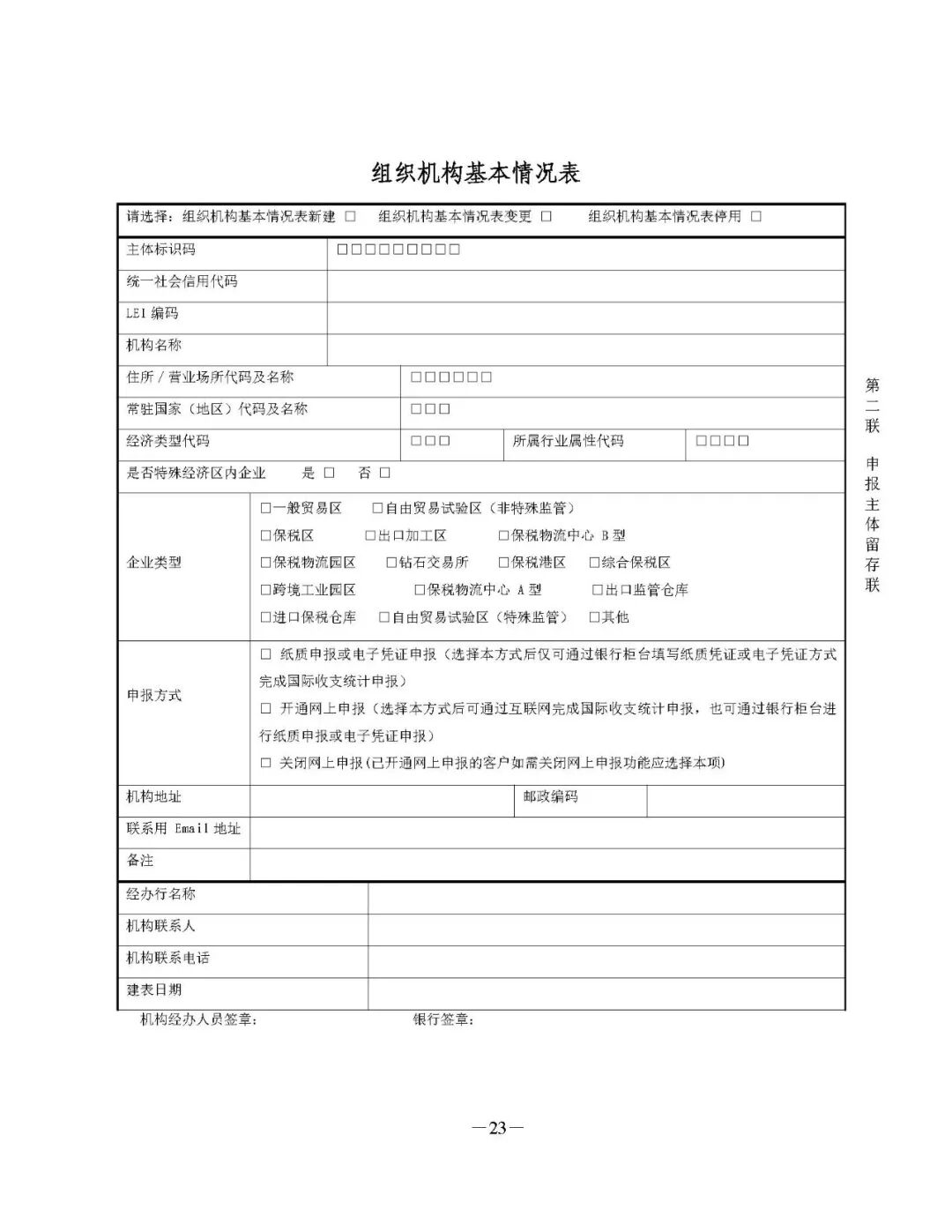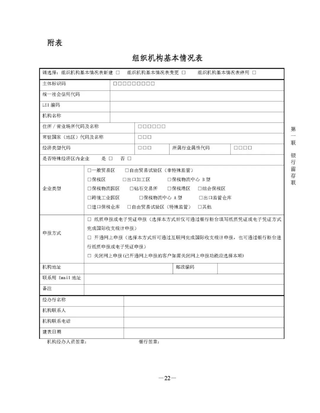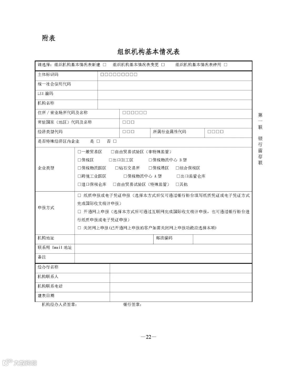 第十六条 对于《组织机构基本情况表》纸质版,境内银行应按照国家外汇管理局规定的内容和格式自行印制,一式两联(见附表),提供给机构申报主体使用。