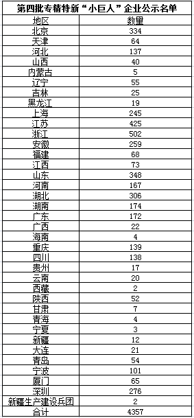 已收集整理了各省、自治区、直辖市及计划单列市、新疆生产建设兵团发布的第四批专精特新“小巨人”企业公示名单。据统计,共有4357家企业入选第四批专精特新“小巨人”企业公示名单。