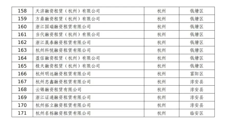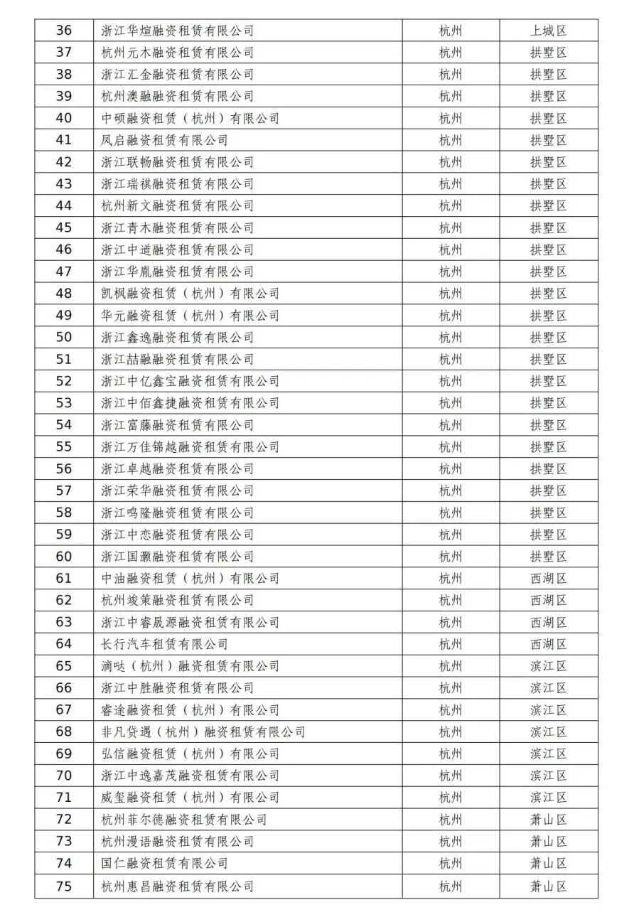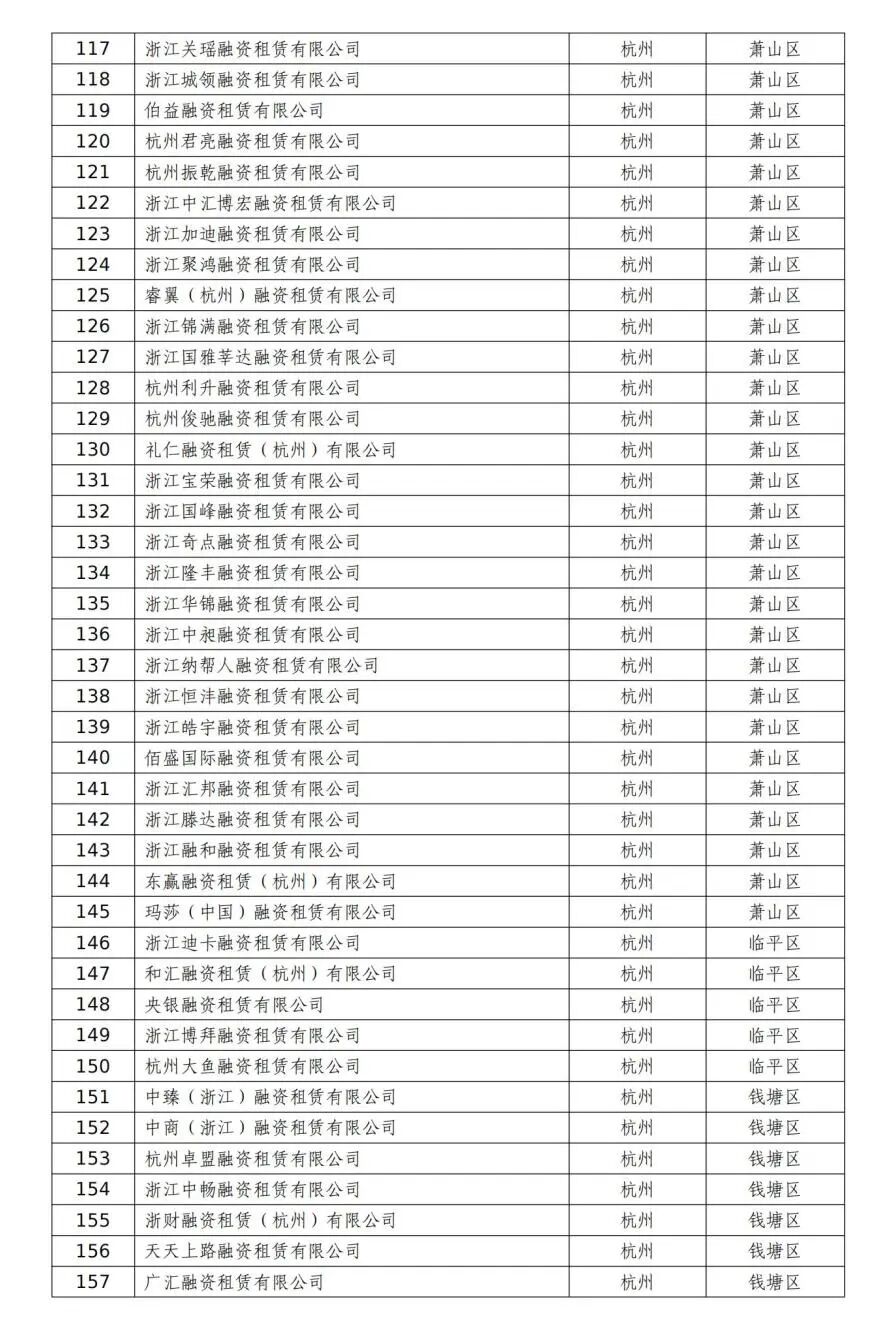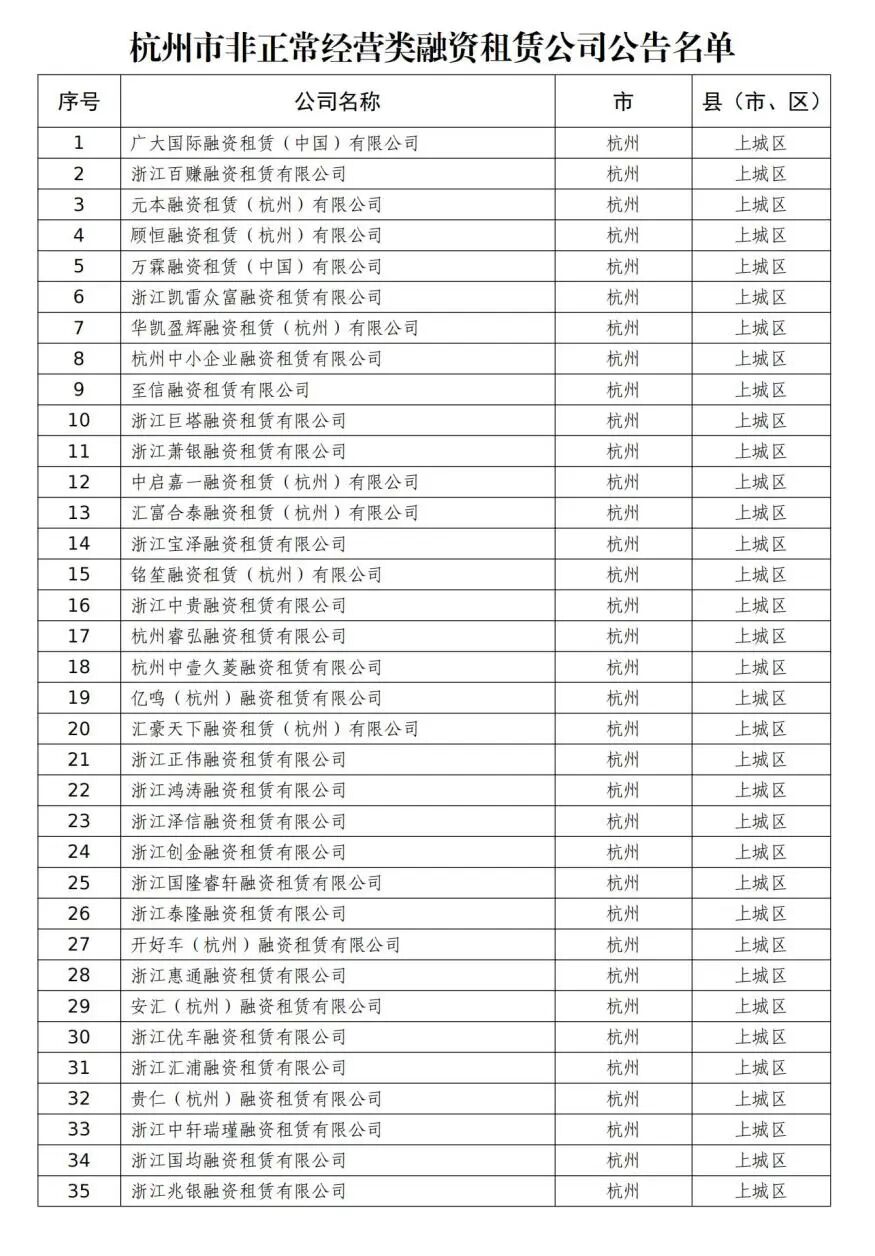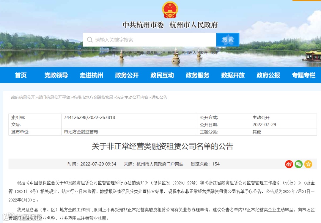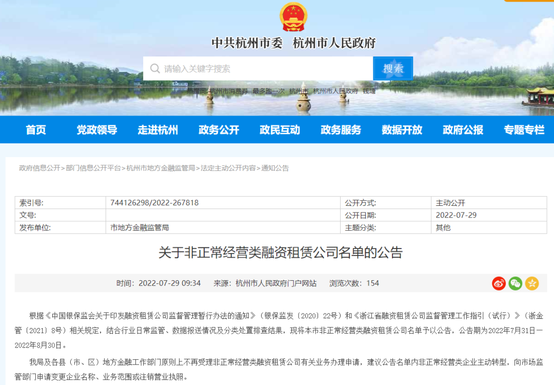 根据《中国银保监会关于印发融资租赁公司监督管理暂行办法的通知》(银保监发〔2020〕22号)和《浙江省融资租赁公司监督管理工作指引(试行)》(浙金管〔2021〕8号)相关规定,结合行业日常监管、数据报送情况及分类处置排查结果,现将本市非正常经营类融资租赁公司名单予以公告,公告期为2022年7月31日—2022年8月30日。