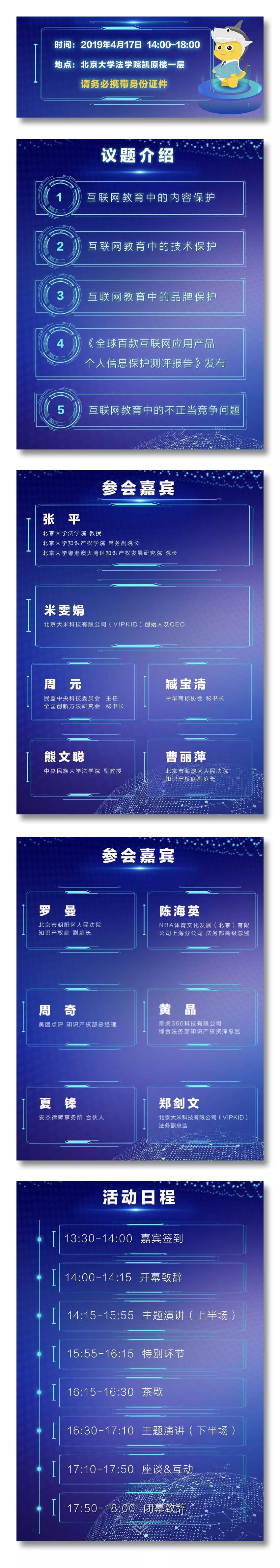 导读:北京大学法学院知识产权学院定于 2019 年 4 月 17 日(周三)14:00 - 18:00 在北京大学法学院凯原楼报告厅举办首届“互联网教育领域知识产权保护论坛”。
