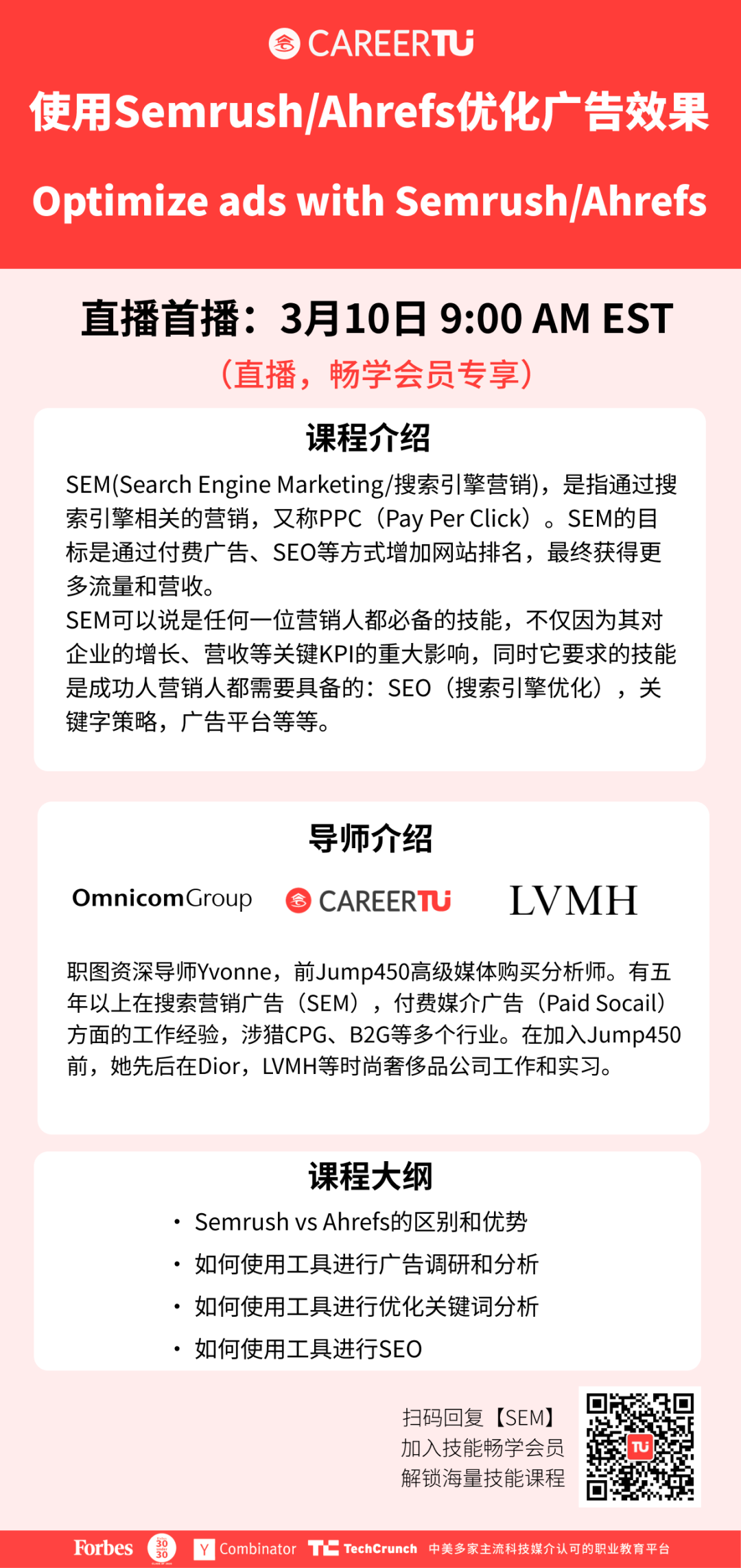 【美东周四9AM直播】使用Semrush/Ahrefs优化SEM效果
