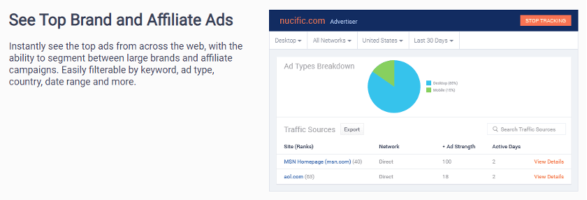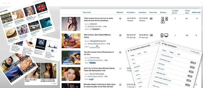 AdBeat有一个独特的抓取系统,包括从20个国家的120个广告网络获取数据,每天抓取超过300万个网页和800万个广告,跨越4种设备类型,并可以显示来自桌面、移动、本地和预滚动广告的广告数据,其中包括Outbrain、Taboola、Revcontent和AdRoll等等,确保数据的准确性。这是发现成功活动和优化自己策略的好方法。