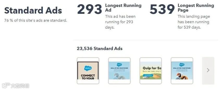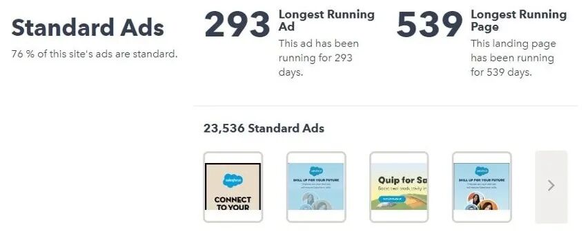 你可以通过这个PPC研究工具看到竞争对手的支出水平,他们使用的广告网络,以及他们的登陆页面。网站的广告商简介部分提供了大量的细节。以SalesForce做例子: