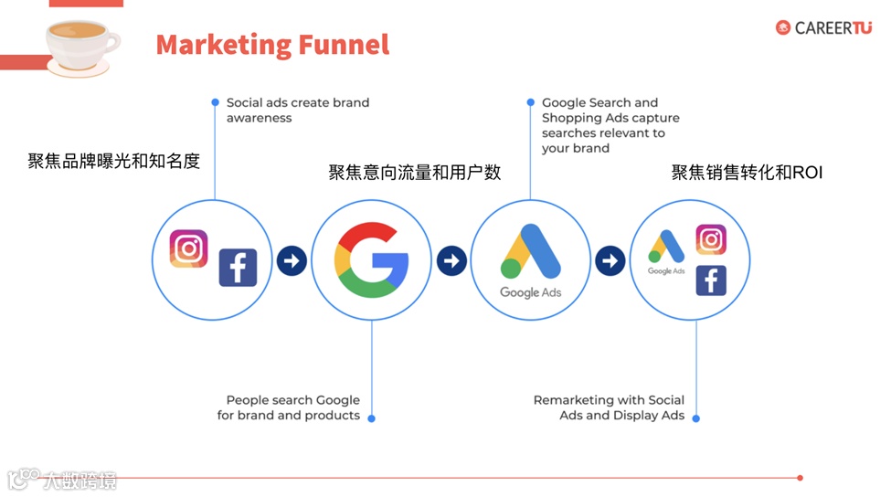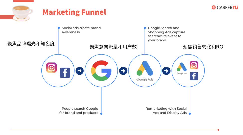 所以当用户对品牌产生了认以及兴趣后,很大程度上就会想要去进一步去了解你的品牌和产品特点。此时,为了承接到来自社媒的流量,去降低漏斗的流失,我们就会需要去做Google广告,在中下游承接住来自上游的流量。