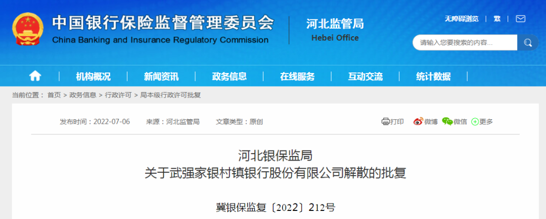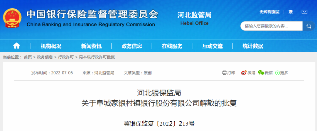 据河北银保监局网站7月6日消息,河北银保监局批复同意武强家银村镇银行股份有限公司、阜城家银村镇银行股份有限公司解散。