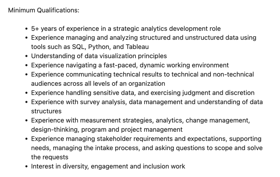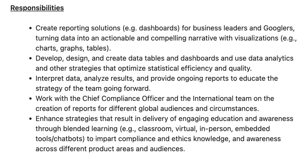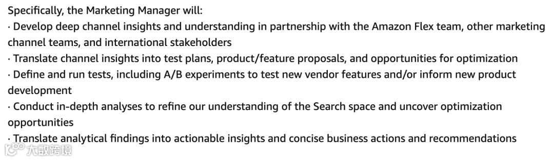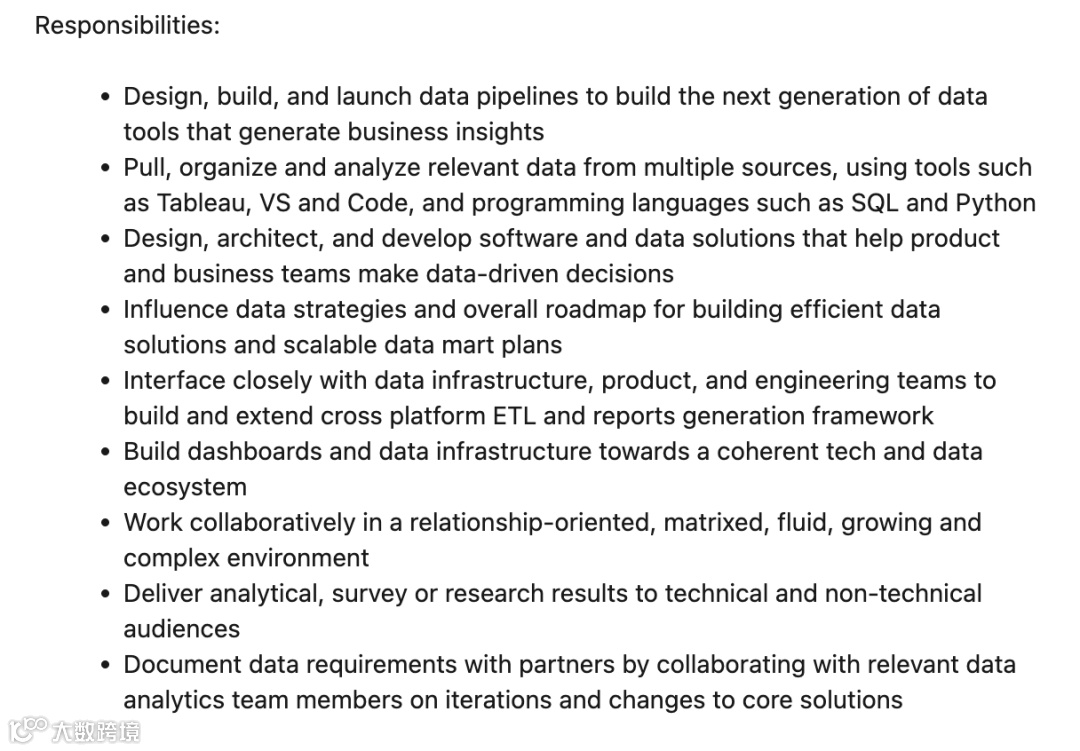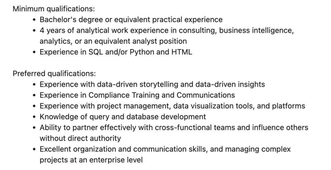 在岗位要求这里,我们看到JD写有战略分析方面的要求。也就是说,需要候选人能够深入研究与业务目标和业务绩效相关的业务模式。候选人除了需要拥有较好的数据分析的能力之外,同时,还需要兼备好的商业逻辑思维Business Sense。