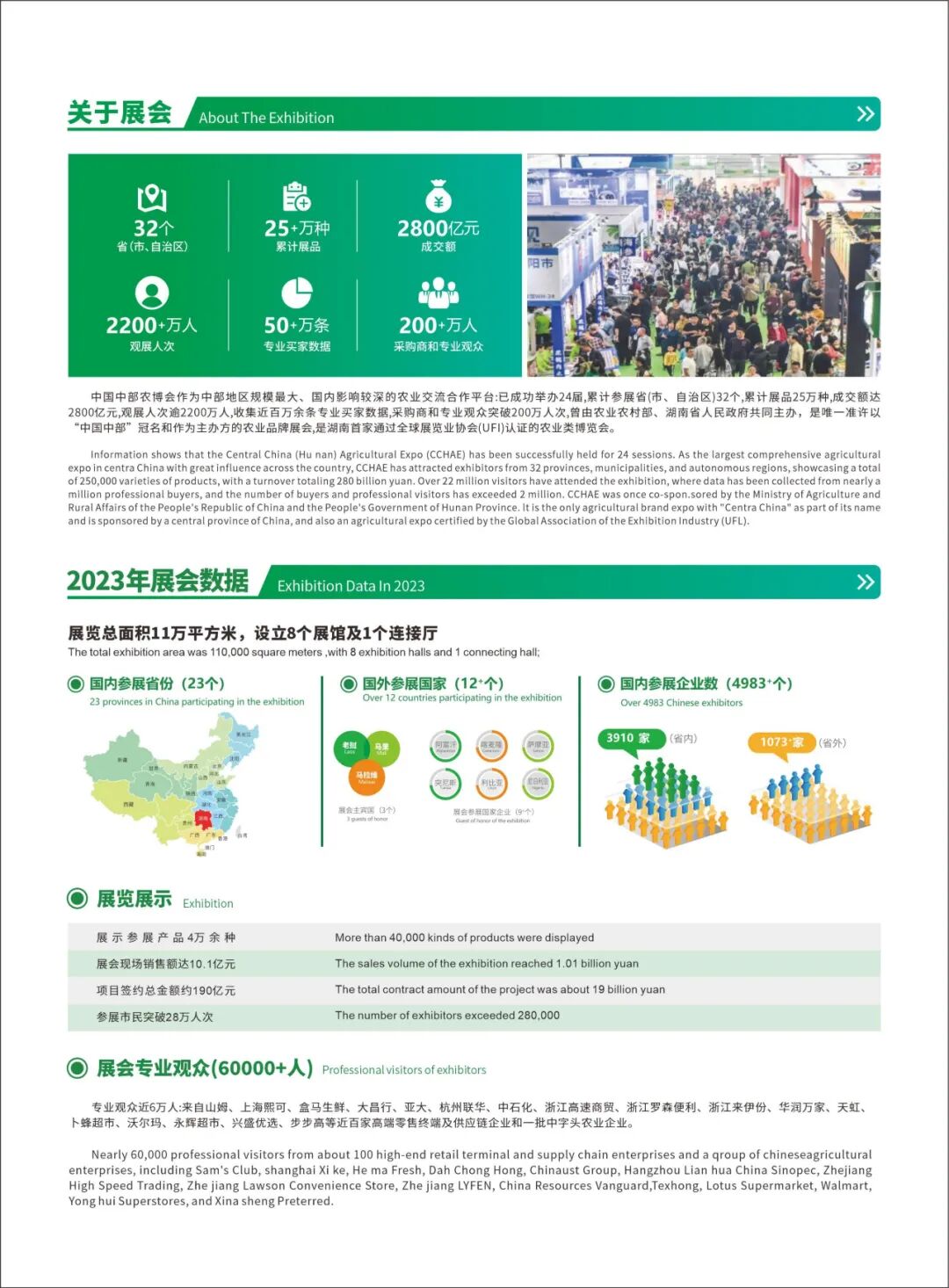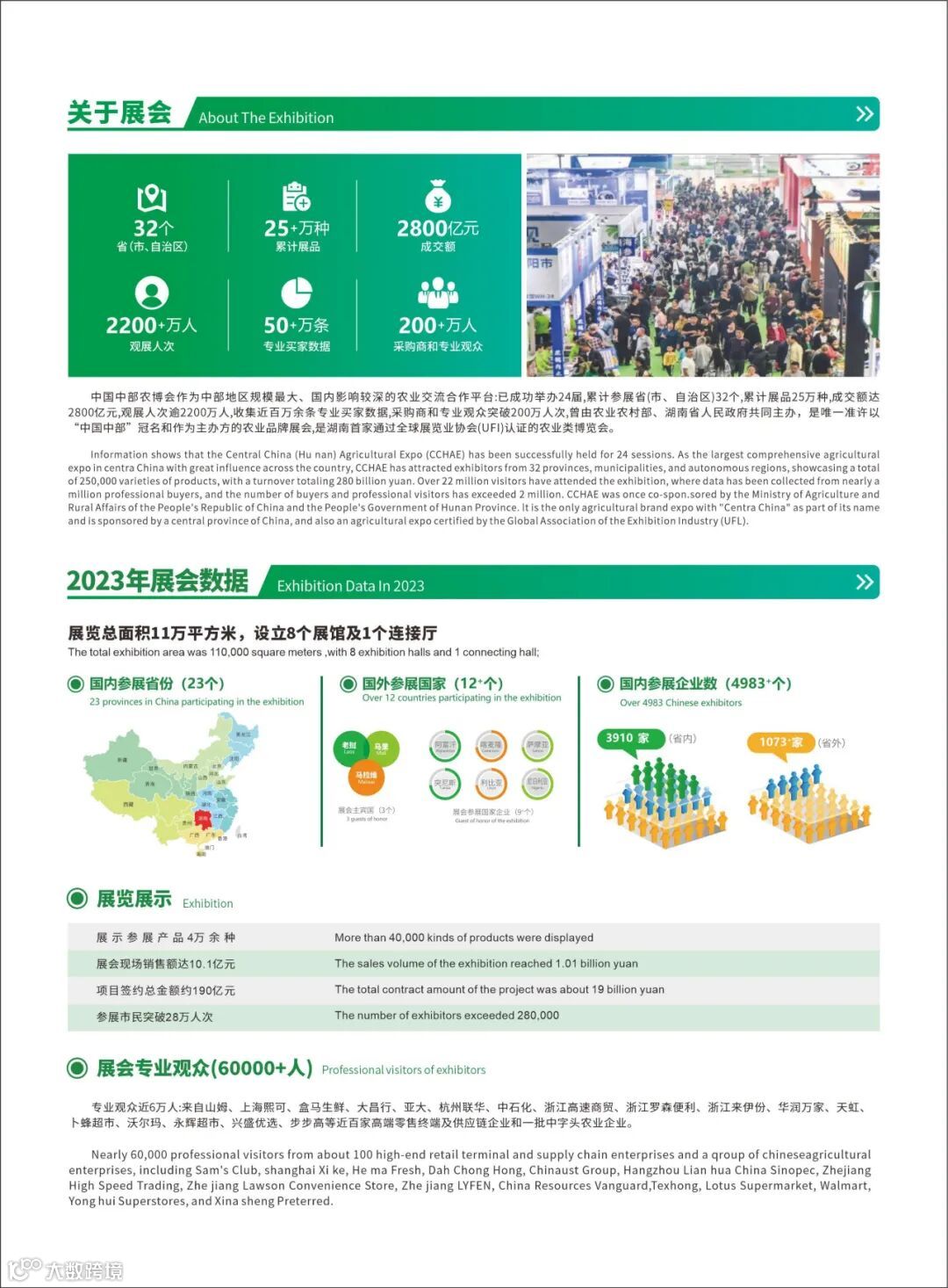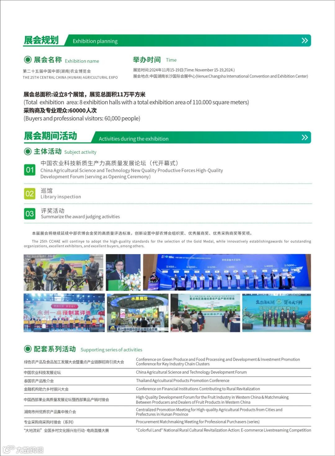 第二十五届中国中部(湖南)农业博览会定于2024年11月15日至19日在长沙国际会展中心举办,本届农博会共规划茶产业馆、特色美食馆、品牌农业馆、果蔬生鲜冷链馆、食品供应链馆、省际交流馆、进出口农产品馆、生态种养馆等8个展馆,展区面积约11万平方米,期间将举办巡馆、中国农业新质生产力赋能农业现代化论坛(代开幕式)、总结大会等主体活动,以及专场推介、产销对接、直播大赛、国际交流等系列活动。